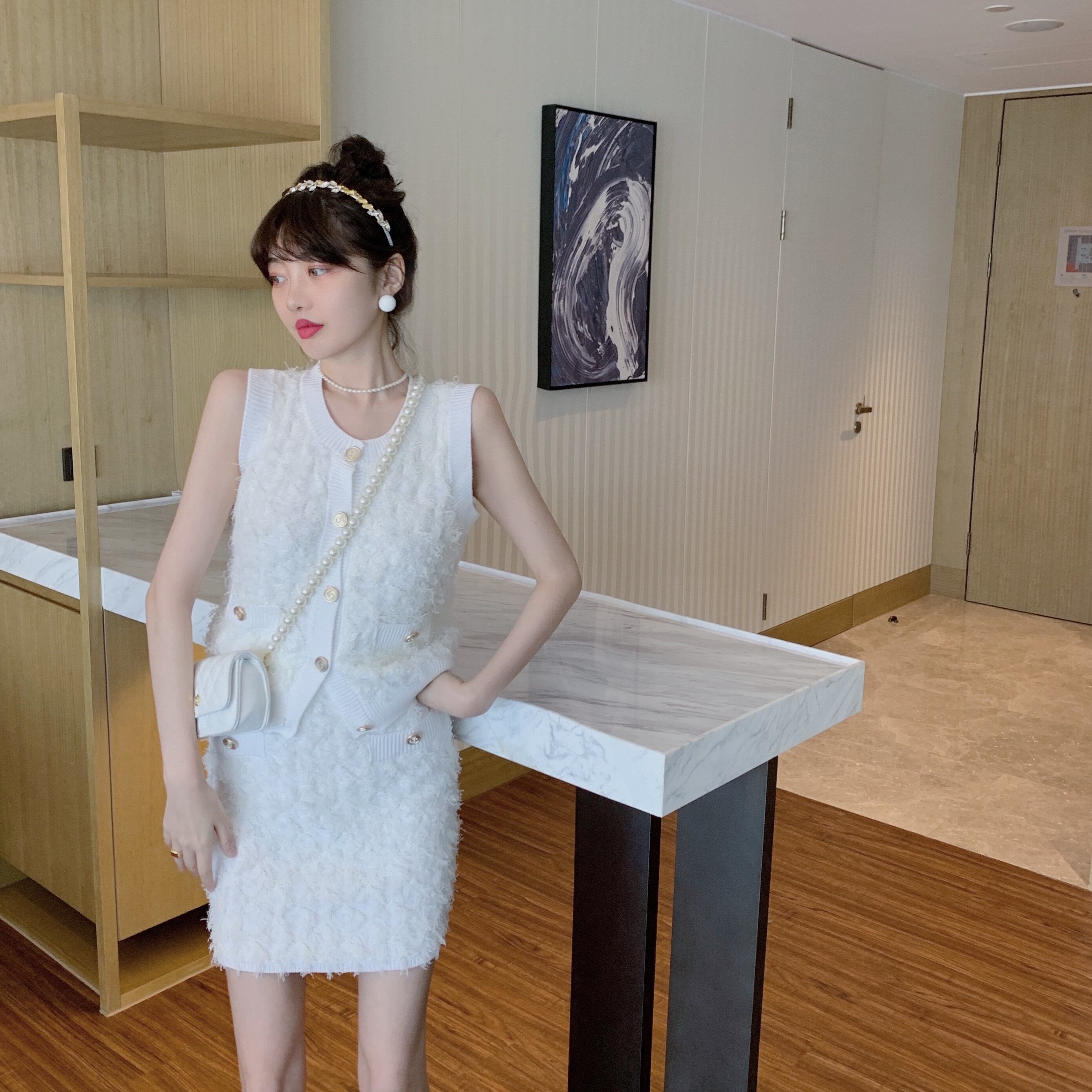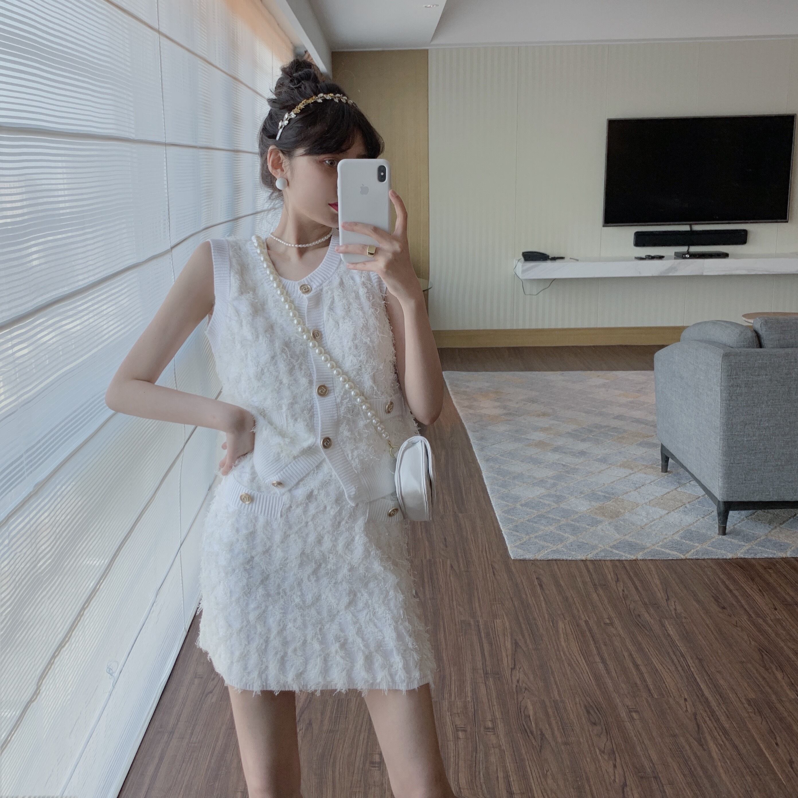 色:フリンジ付きハイウエストバッグヒップニットスカート,フリンジかぎ針編みノースリーブニットカーディガン