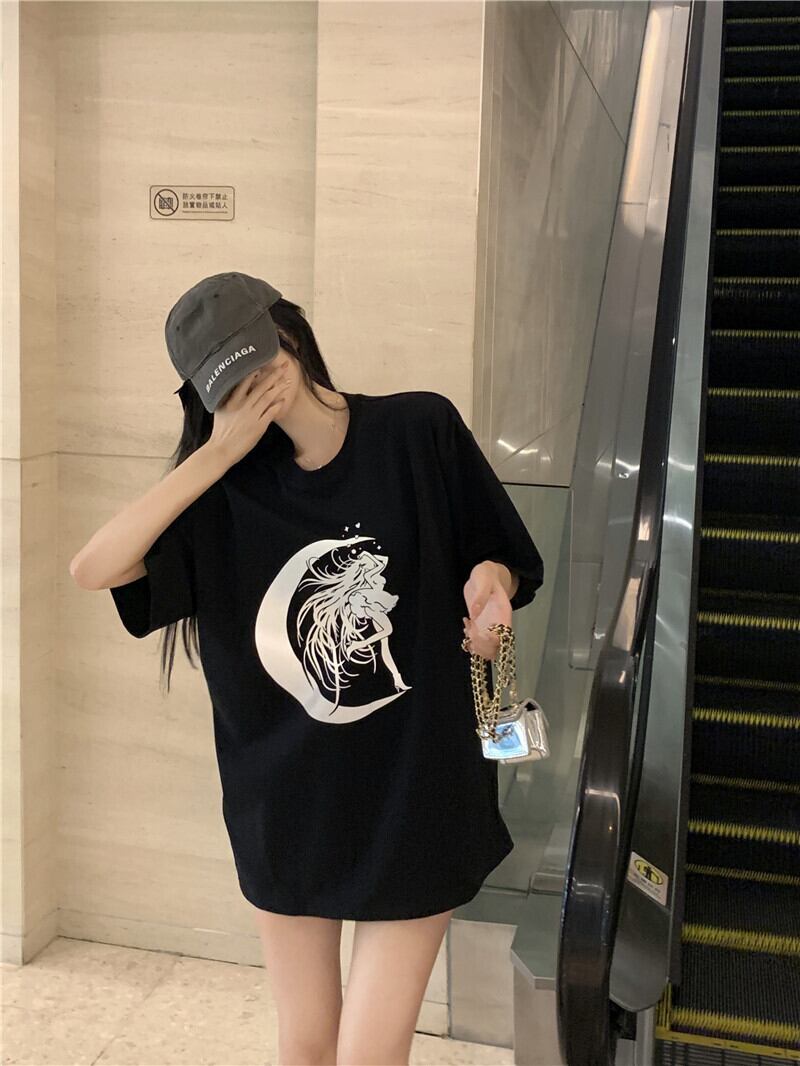 プリントTシャツ サマー薄手ラウンドネック半袖スリーブルーズカジュアルロングブラックトップス ショート ハーフスリーブ 夏物 Oネック セブンプリンセス64564685991