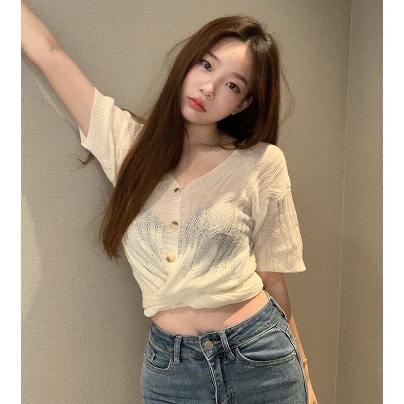 サマーVネックカーディガンニットショートルーズブラウス 夏物 シルク セブンプリンセス90688207671