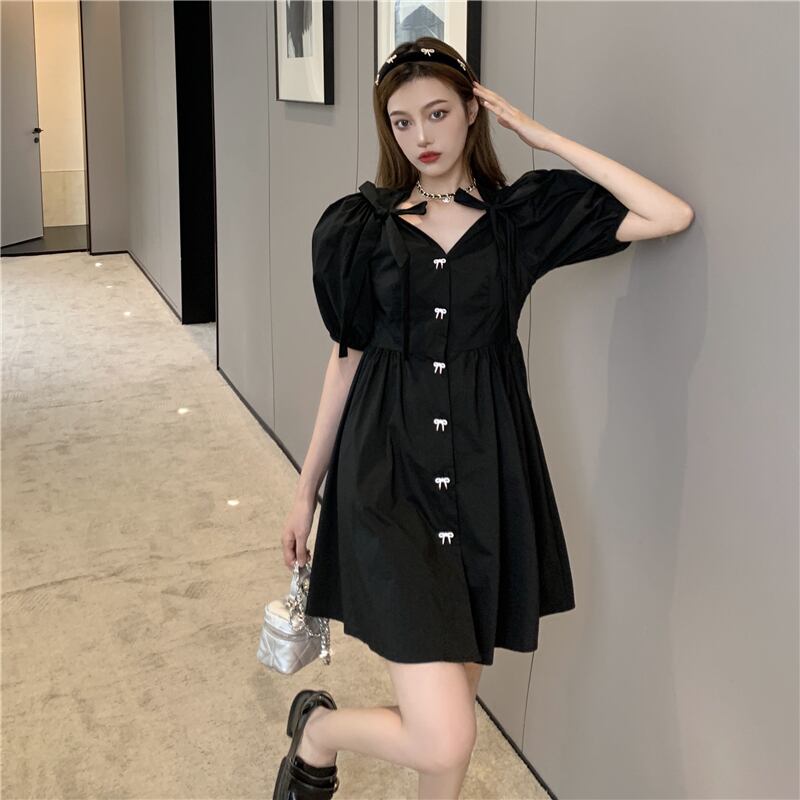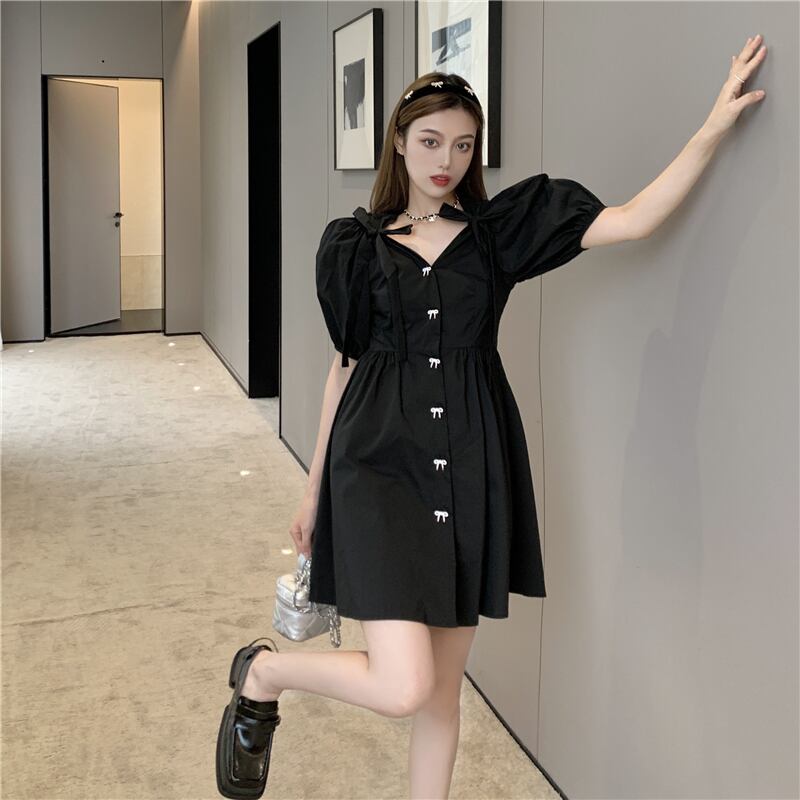 スタイルドレス スタンダードスリーブウェストAラインショートスカート サマーVネック薄手 レトロ 夏物 セブンプリンセス3845270021