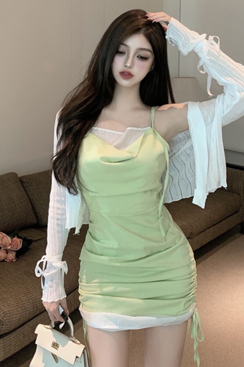 色:白いカーディガン,緑のドレス