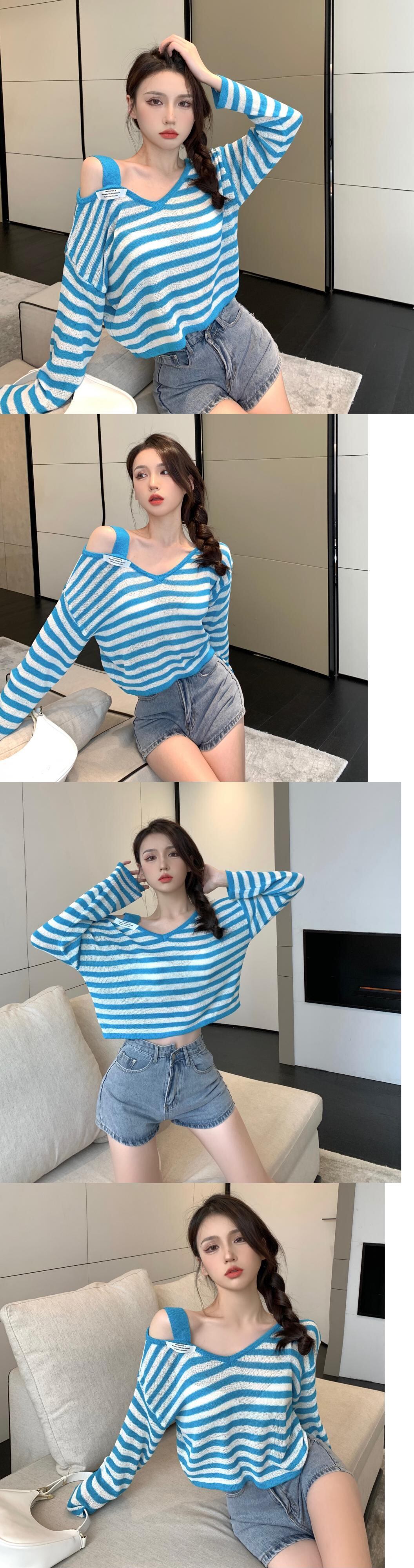 ストライプブラウス レディースサマー薄手ルーズニットセーター Vネックショートトップス ロング 夏物 オフショルダー セブンプリンセス74585735135