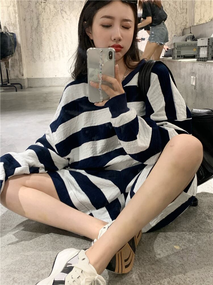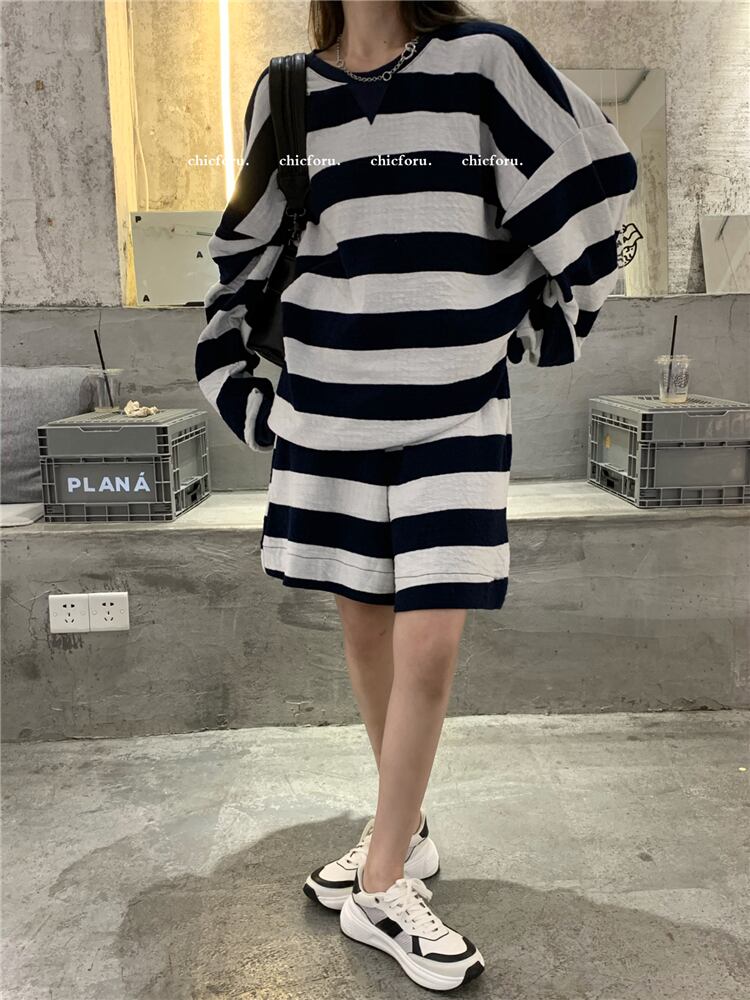 パンツ サマーカジュアルルーズストライプシャツ ハイウェストショーツ ロング ストリート 夏物 ブルマー セブンプリンセス86828855175