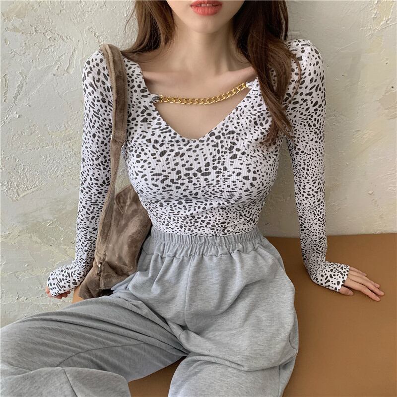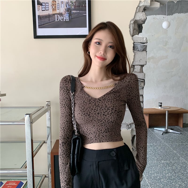 レオパードプリント柄Tシャツ サマー薄手Vネックスリムショートトップス ロング 夏物 セブンプリンセス30703349933