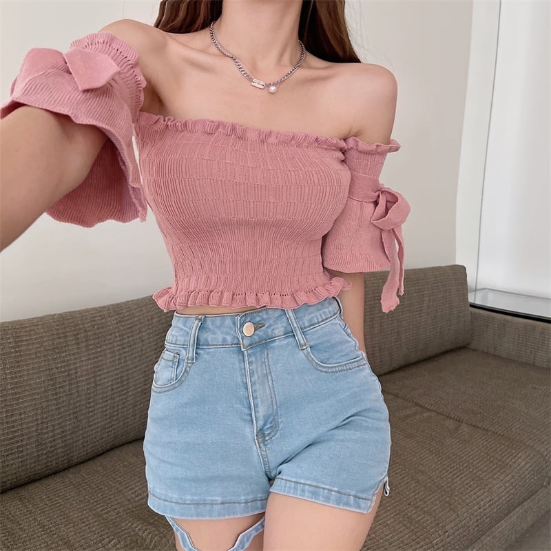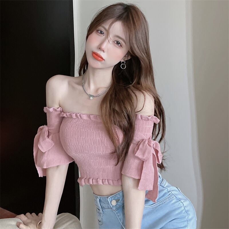 Tシャツ サマーリボン薄手ニットショートスリムクロップドトップス 夏物 セブンプリンセス36664568316