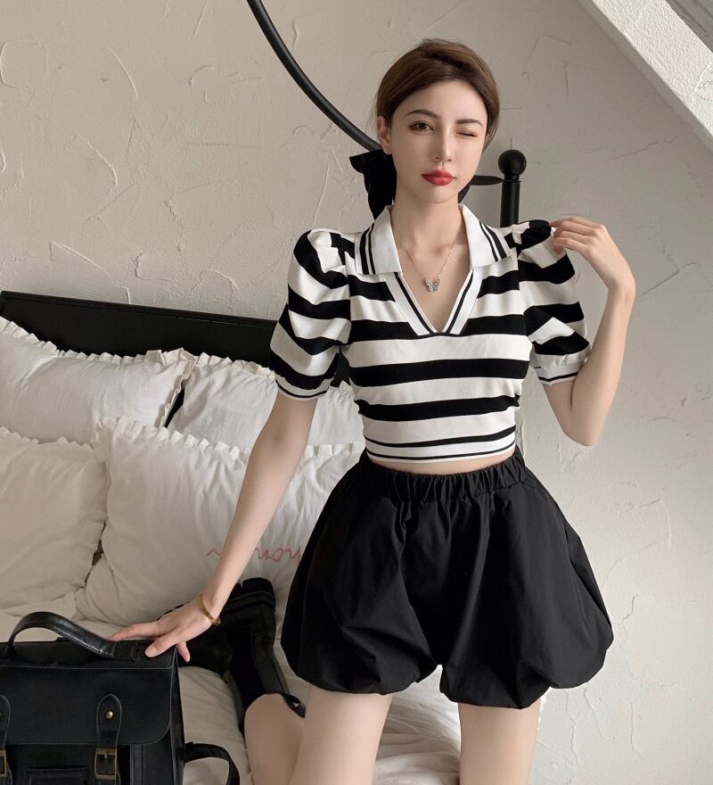 色:ストライプトップ,黒のショートパンツ