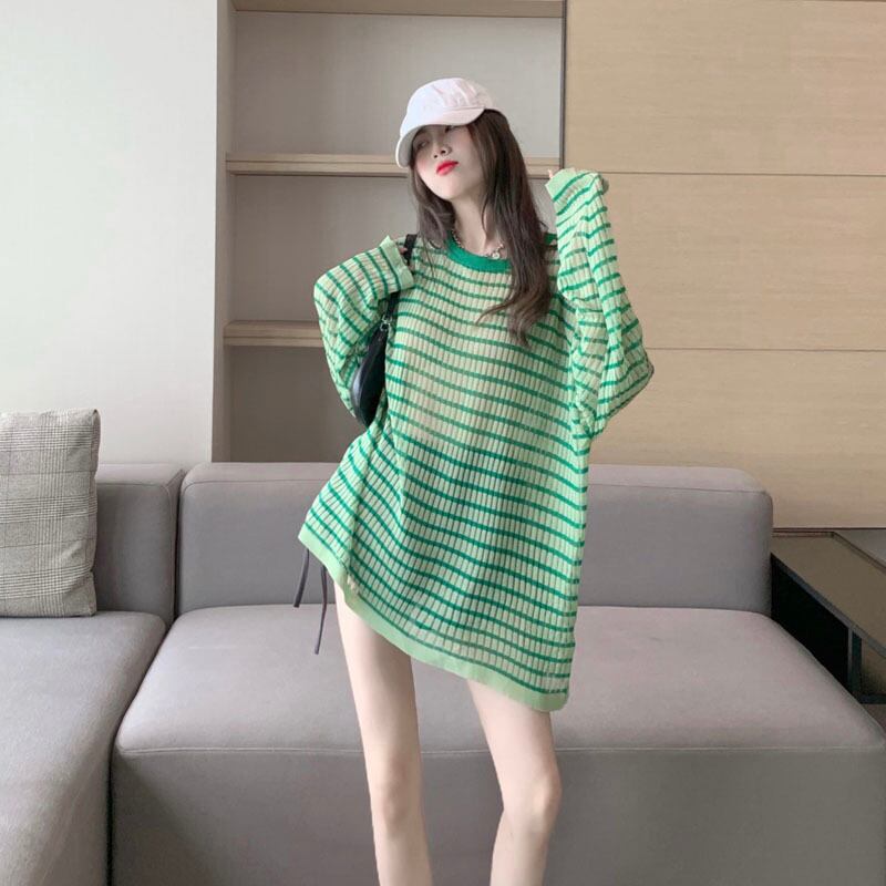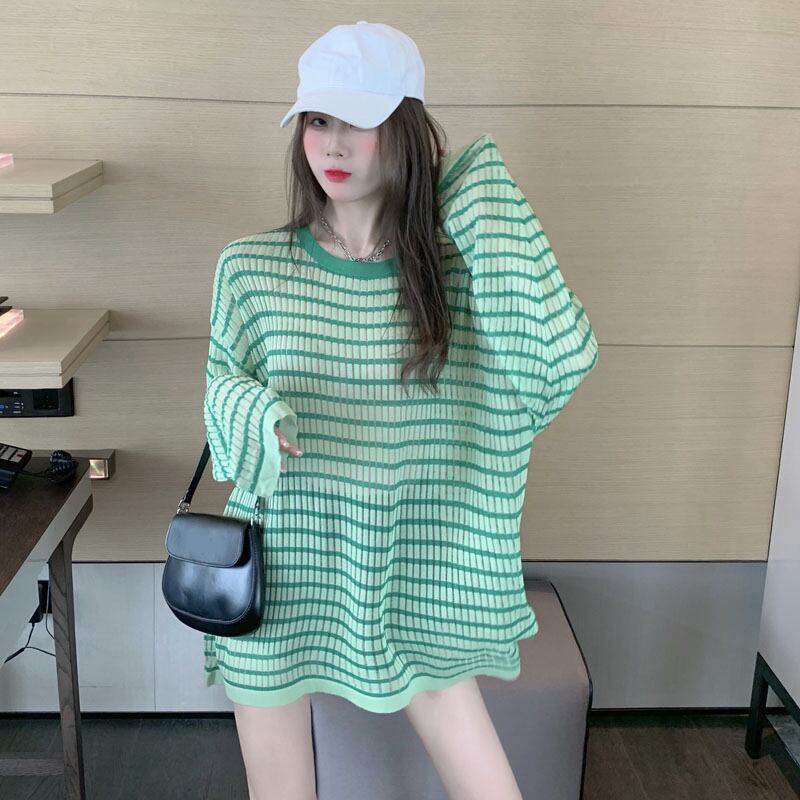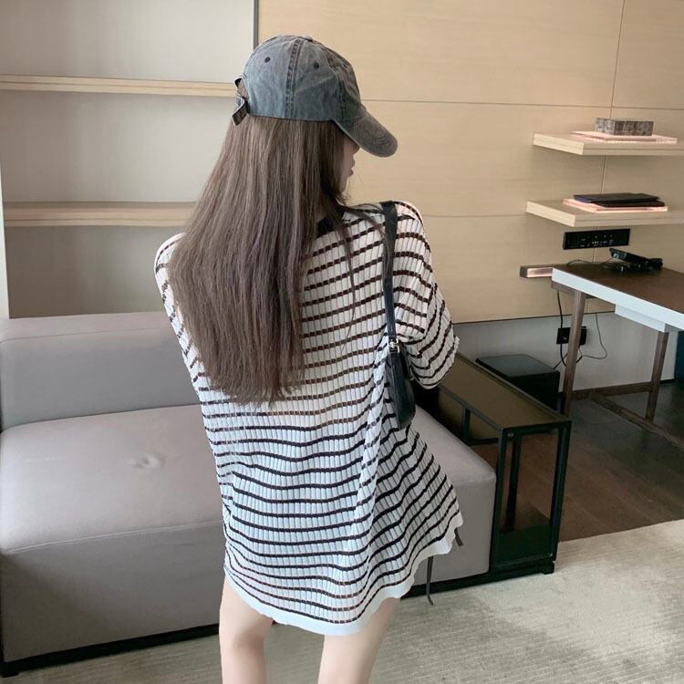 Tシャツ シャツ サマールーズストライプニットトップス ロング 夏物 シルク セブンプリンセス1035925796
