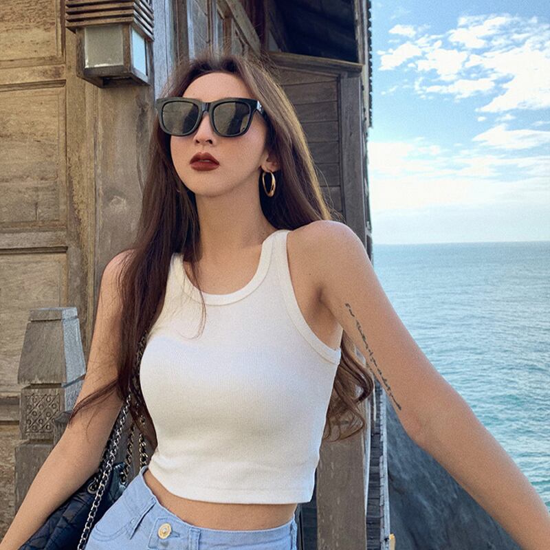 レディースサマーノースリーブシャツ ブラックショートトップス 夏物 ヨーロピアン セブンプリンセス64845677387