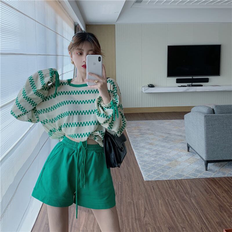 サマーカジュアルストライプブラウス トップス ショーツ セット ストリート 夏物 ブルマー セブンプリンセス51099479276