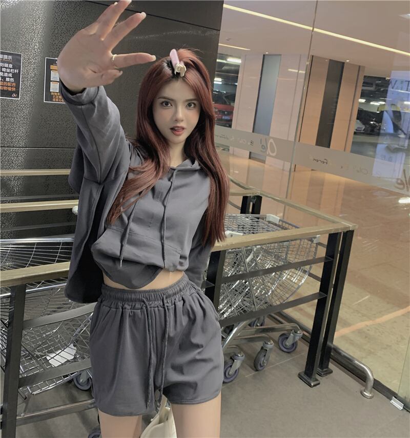 色:ピンクのショートパンツ,ピンクのフード付きトップス,グレーのショートパンツ,灰色のフード付きトップ
