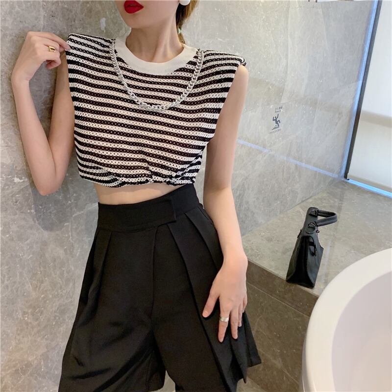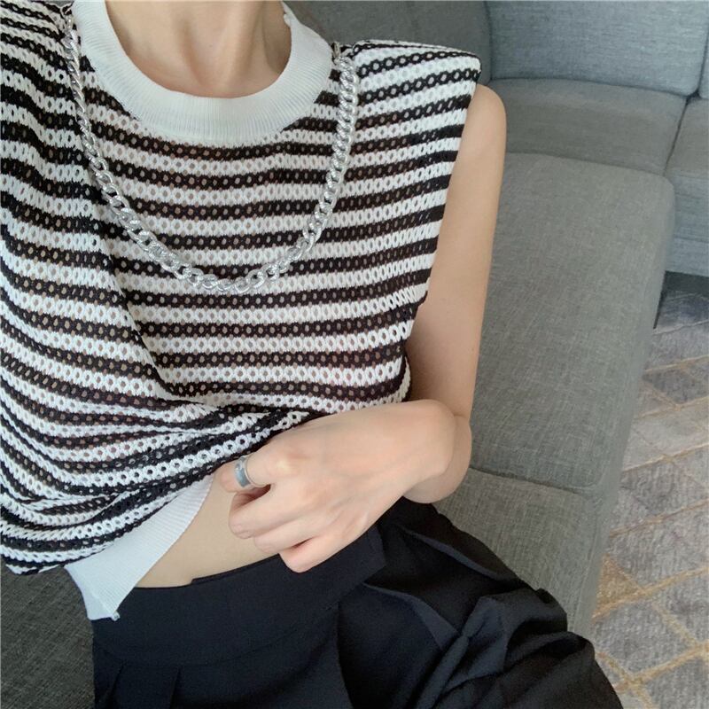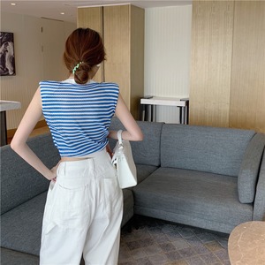 ニットセーター 薄手レディースサマーストライププルオーバー ルーズノースリーブショートトップス 夏物 セブンプリンセス77649587727
