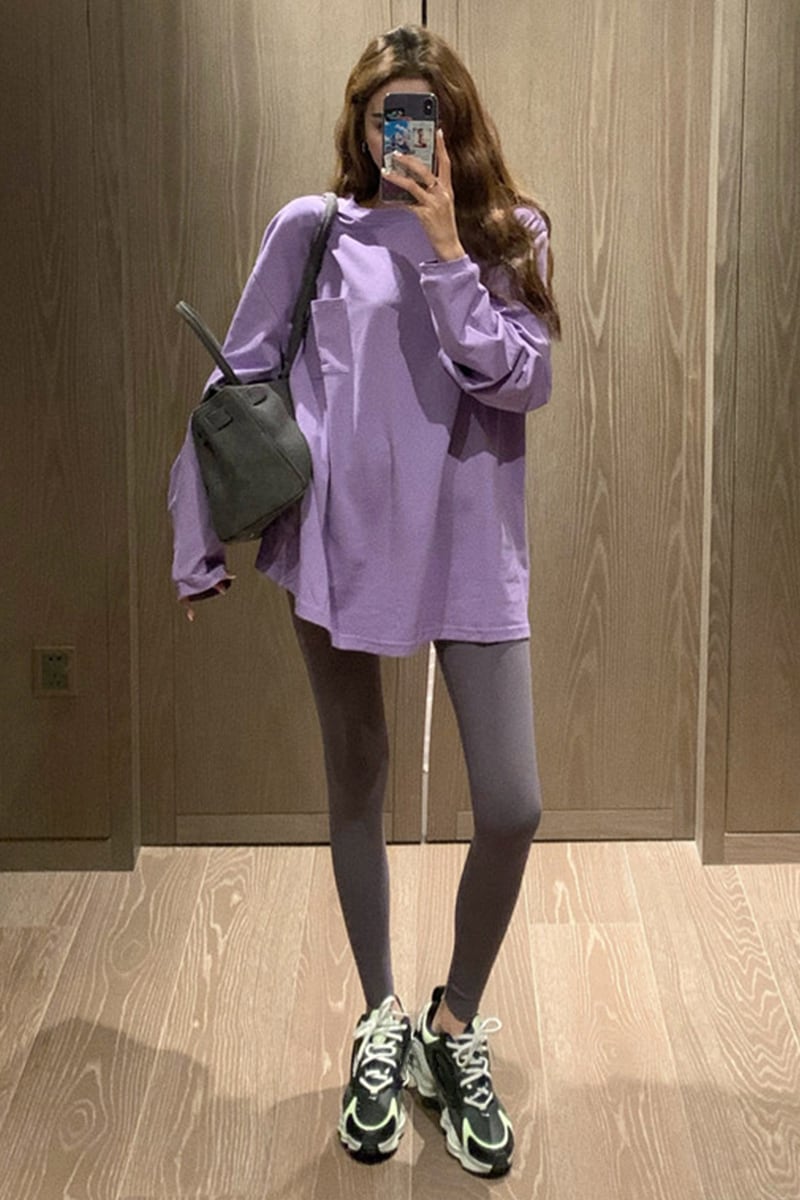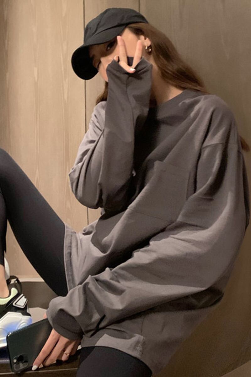 Tシャツ シャツ ルーズオータムラウンドネックポケットカラーレッド薄手 ロング 秋物 Oネック ピュア セブンプリンセス82574576218