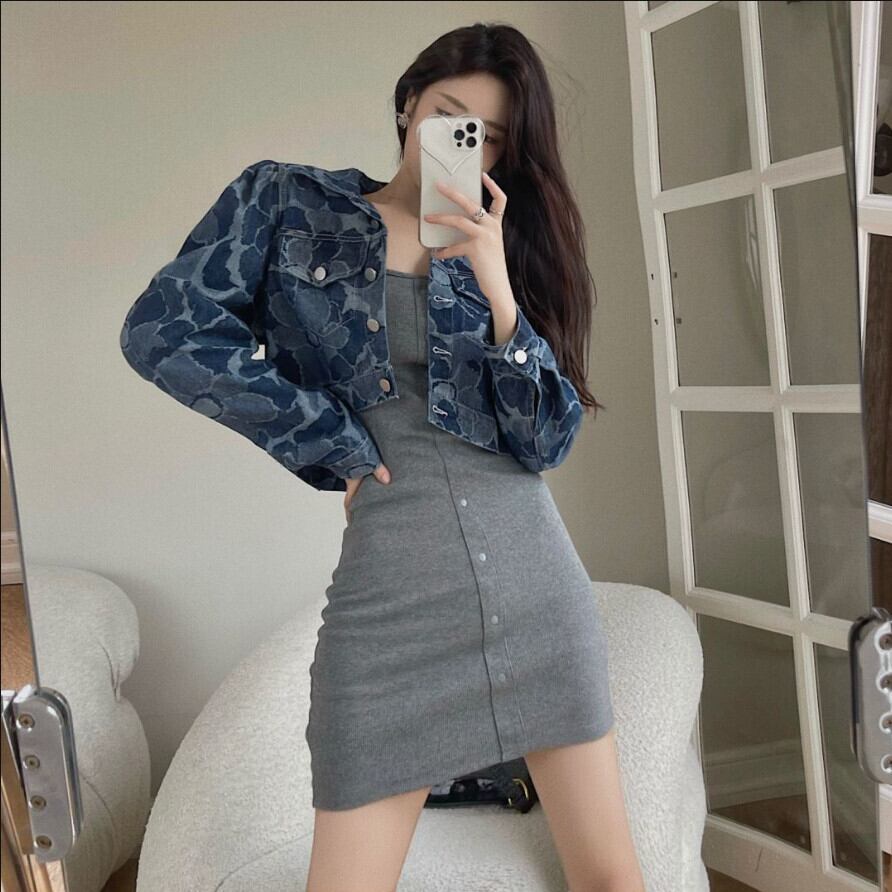 色:グレーのドレス,ブラックサスペンダースカート,ジージャン