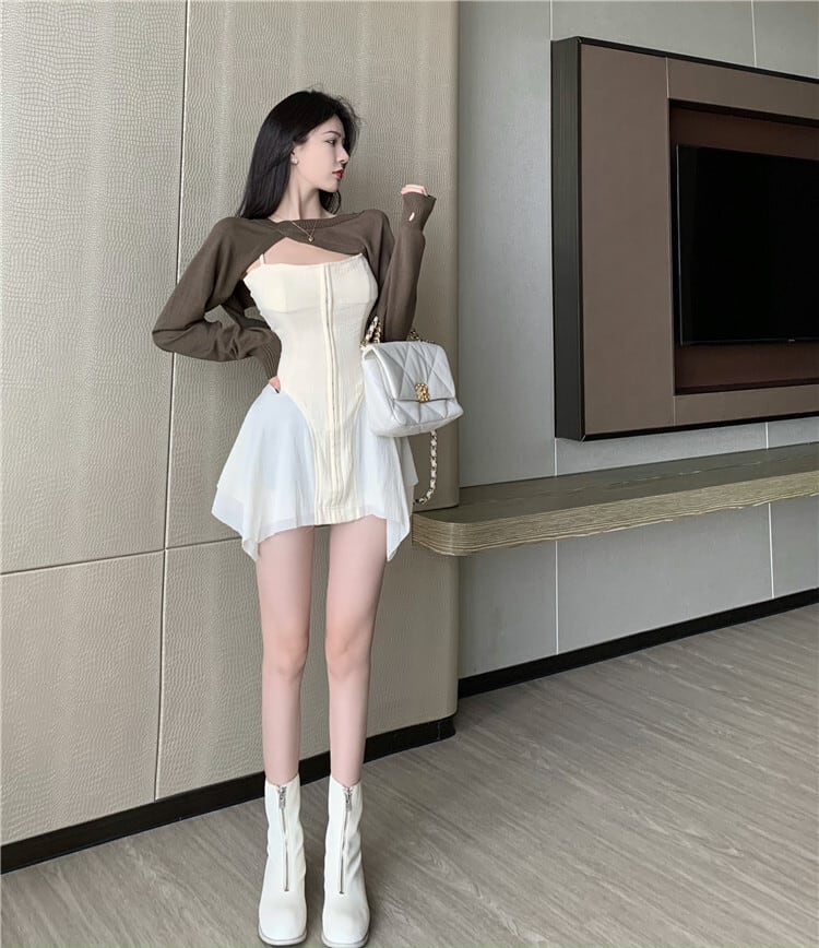 色:オフホワイトのドレス,コーヒーカラーブラウス