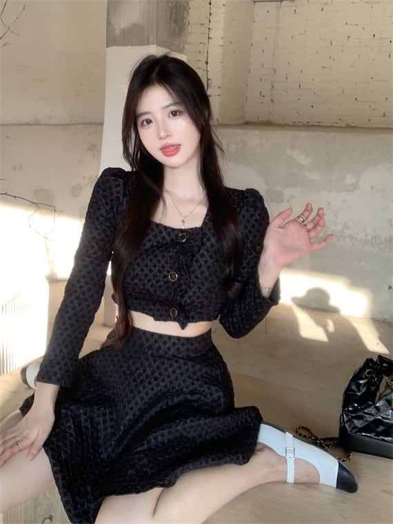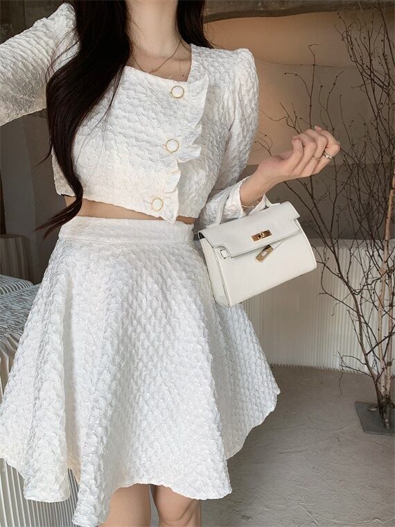 色:白いスカート,ホワイトトップ,黒スカート,ブラックトップ