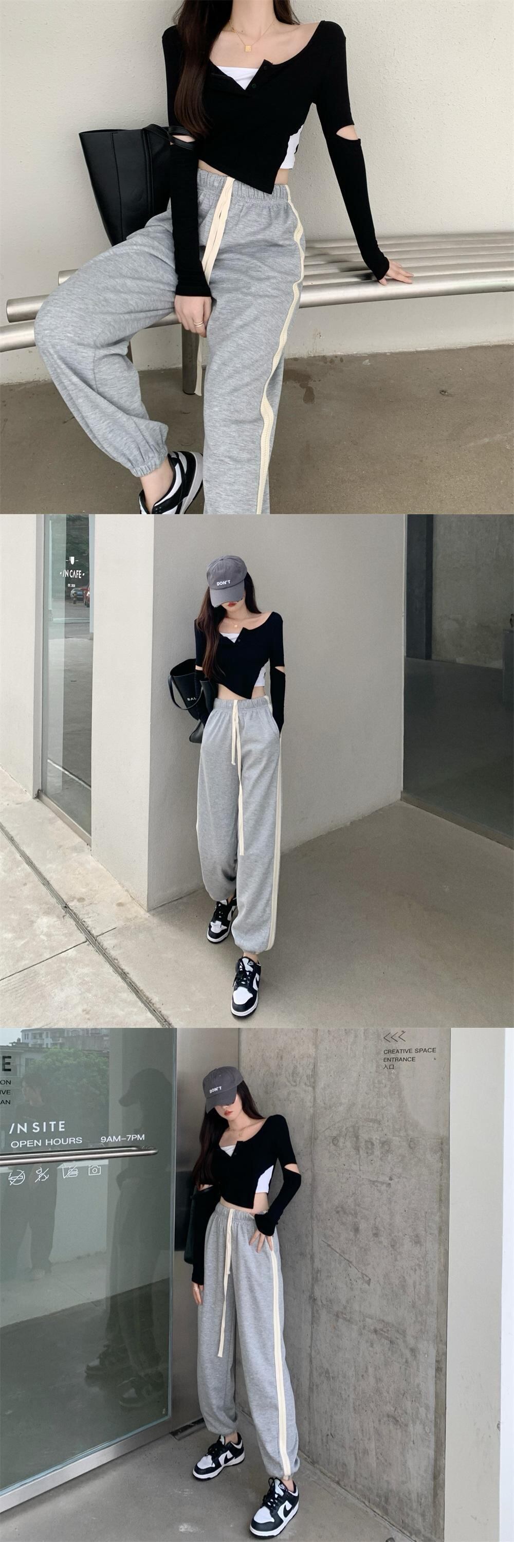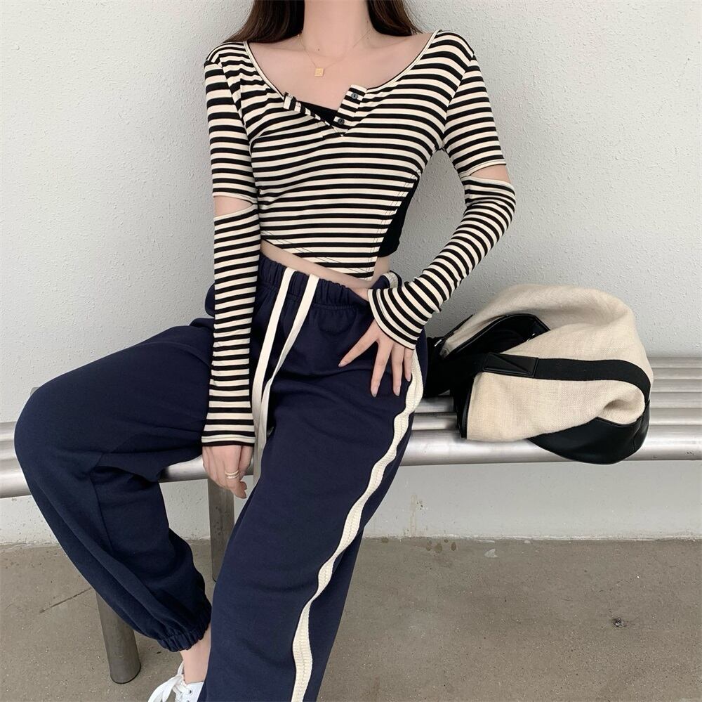 色:ストライプトップ,ブラックトップ,ダークブルーのズボン,グレーのズボン