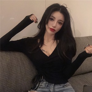 オータムショートTシャツ シャツ スリムギャザーVネックスタイルトップス ロング 秋物 セブンプリンセス34203462377