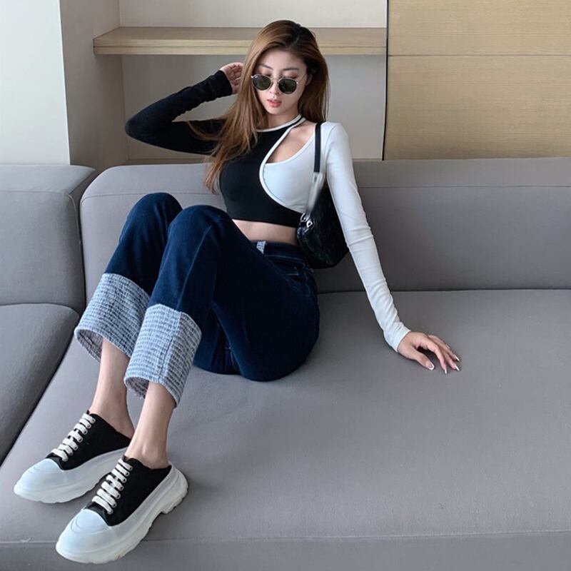 ハイウェストウェストジーンズ パンツ スプリングオータムスタンダード薄手 レトロ 春物 秋物 ステッチ セブンプリンセス14775839872