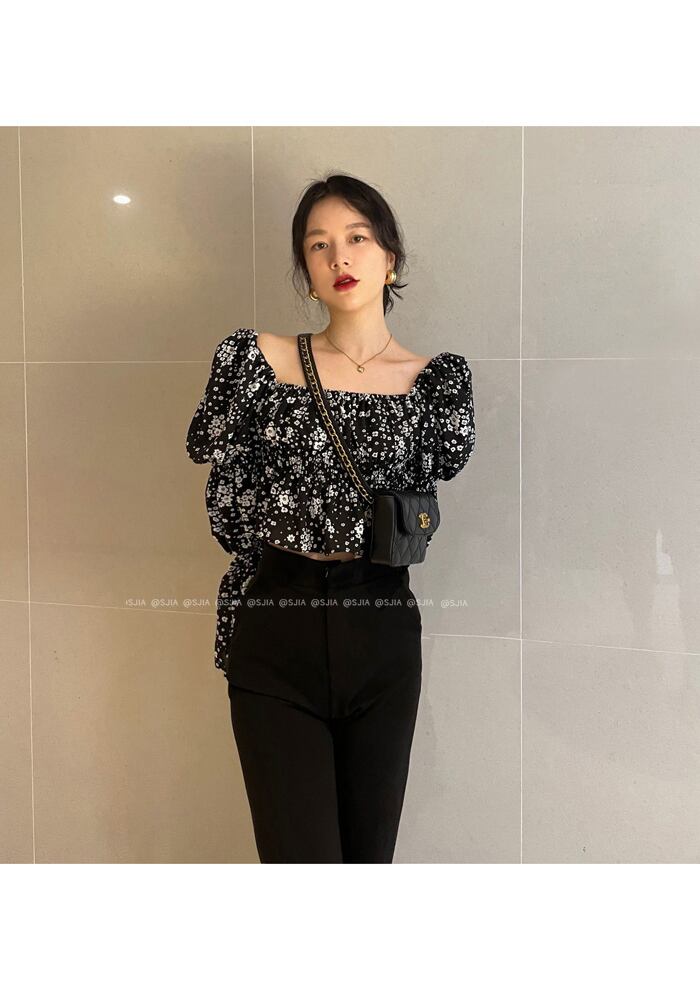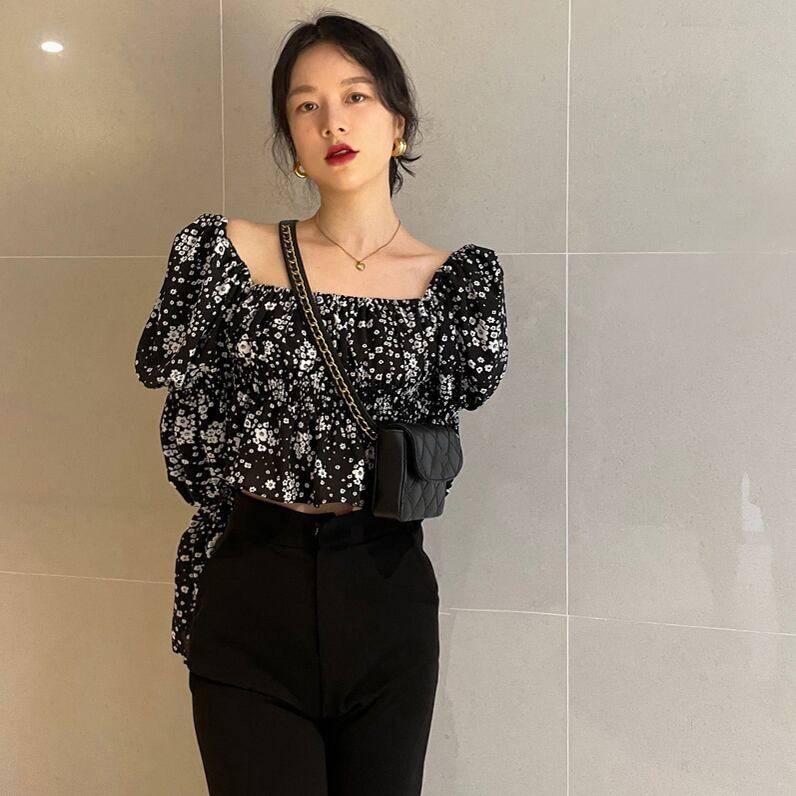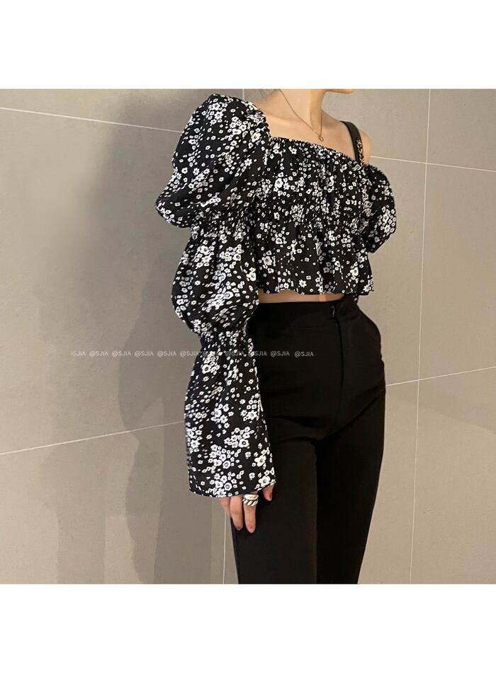 スタンダードフローラルシャツ オータムスタイルスリーブトップス ショート レトロ 秋物 花柄 セブンプリンセス1788892644