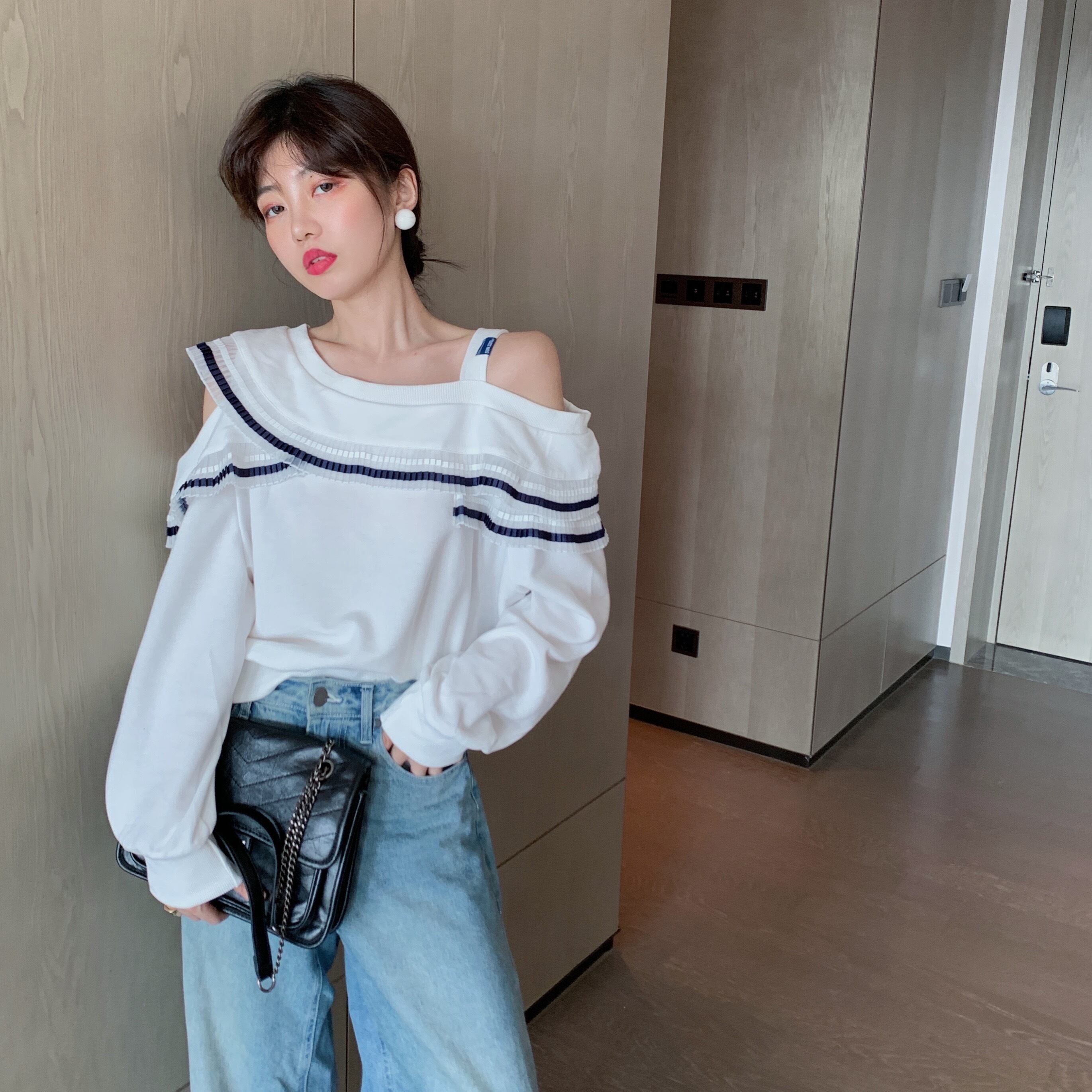 オータムスタイルスタンダードストラップレススリーブルーズ薄手セーター レディース ランタンスリーブ レトロ 秋物 ステッチ セブンプリンセス91714888019