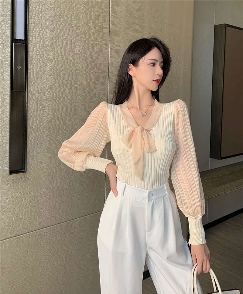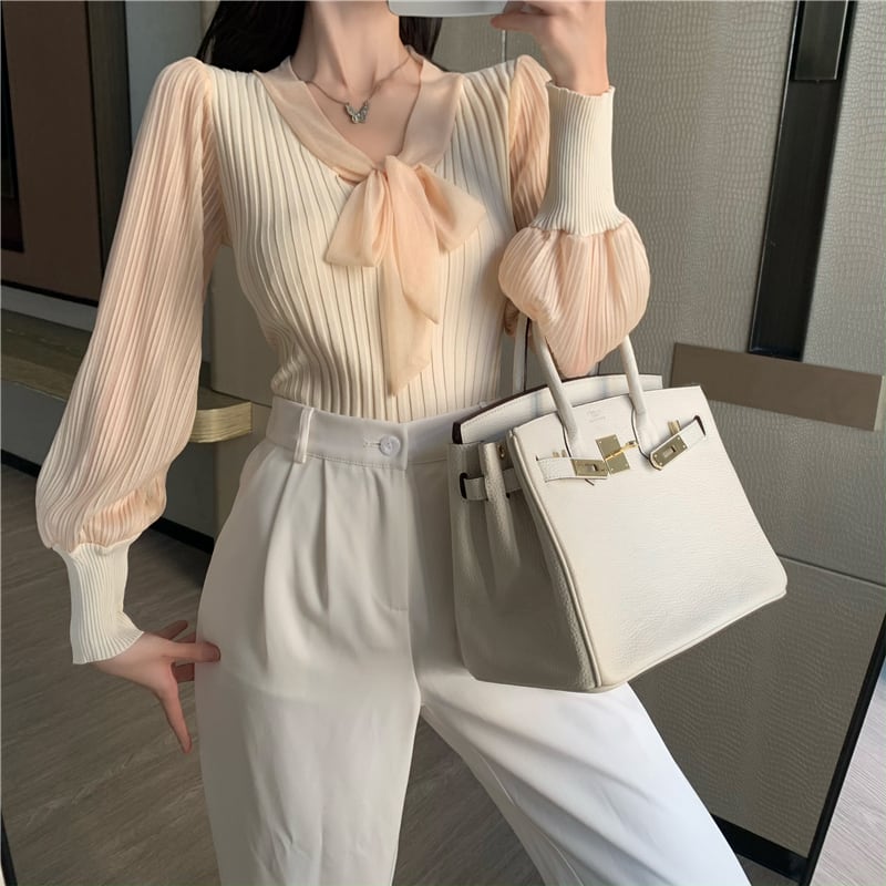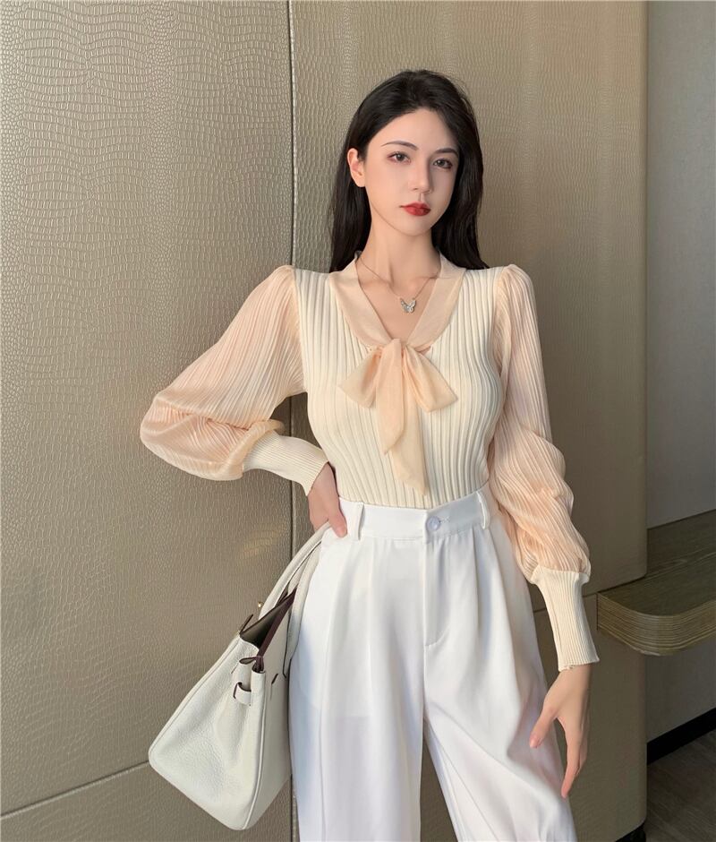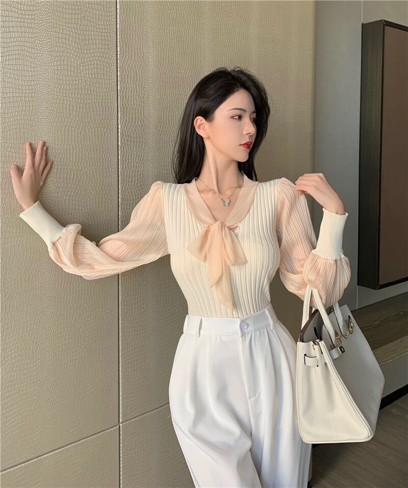 オータムニットセーター 薄手Vネックスタンダードショートシャツ ロング リボン レトロ 秋物 ステッチ セブンプリンセス69968464209