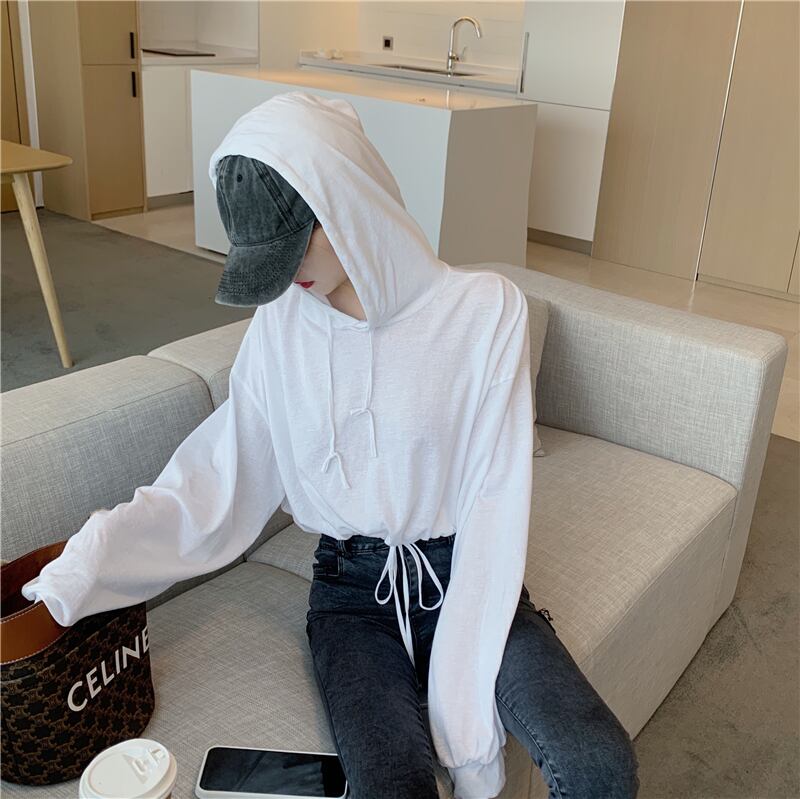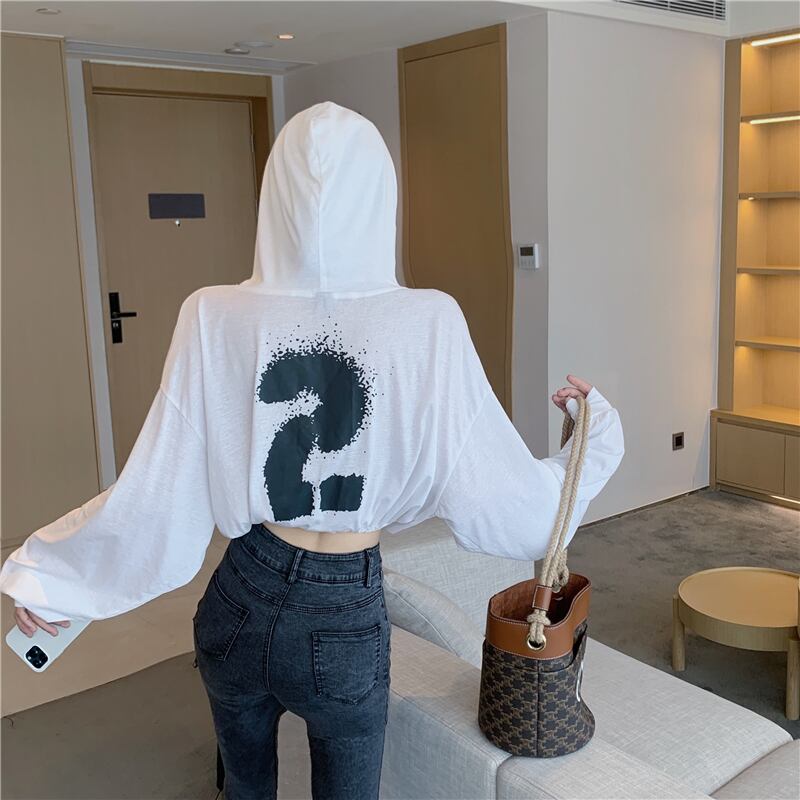 フードセーター スプリングオータム薄手ルーズショートレッドプリントギャザートップス ロング 春物 秋物 セブンプリンセス37736240439