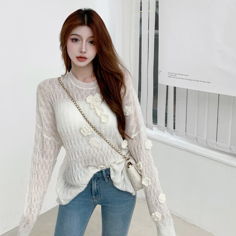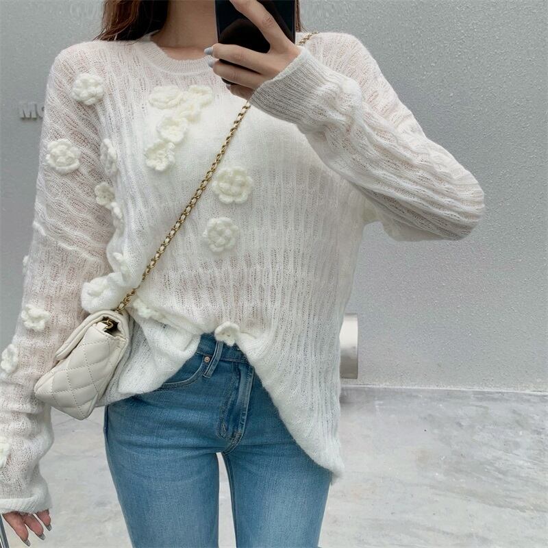 オータムニットセーター レディースルーズスタイルFlowerデザイン プルオーバー トップス ロング 秋物 フラワーデザイン セブンプリンセス30453904485