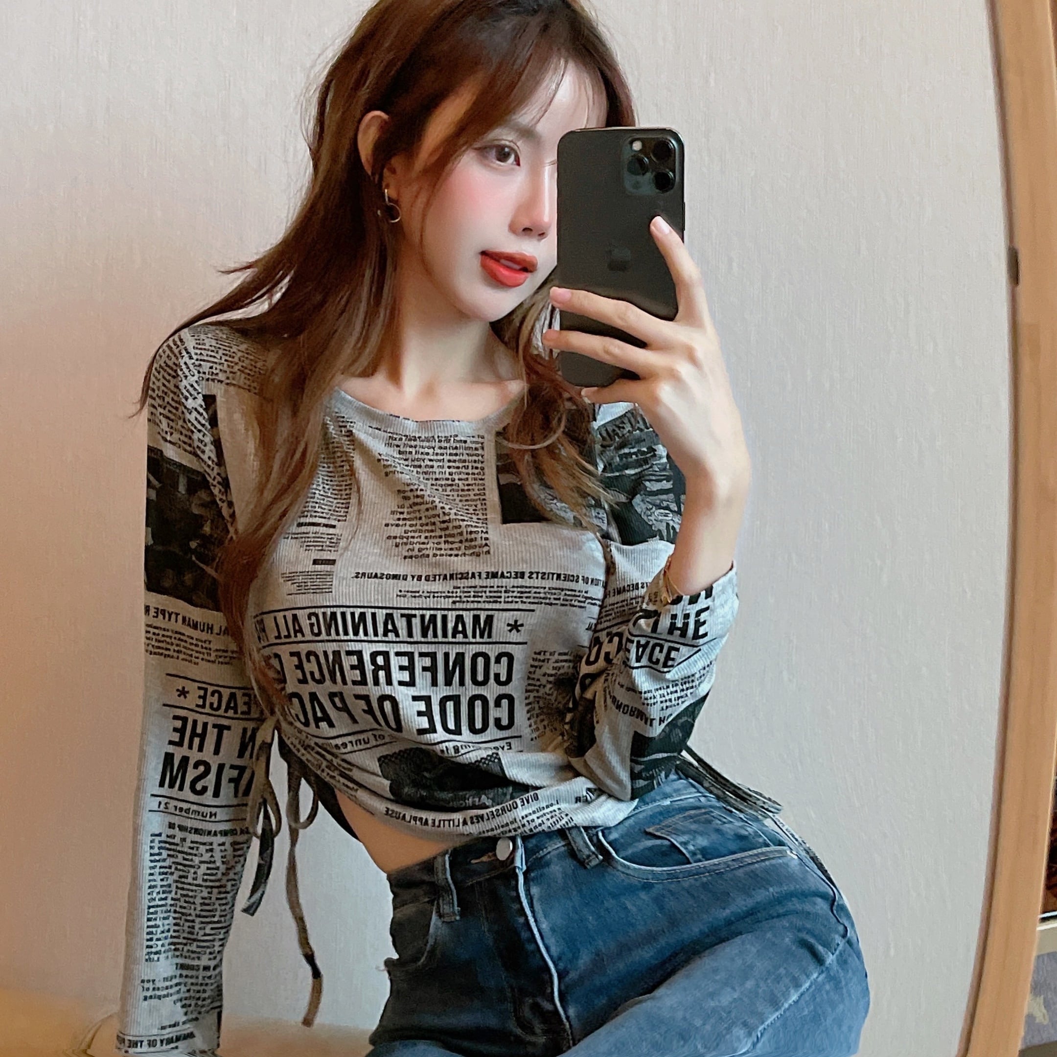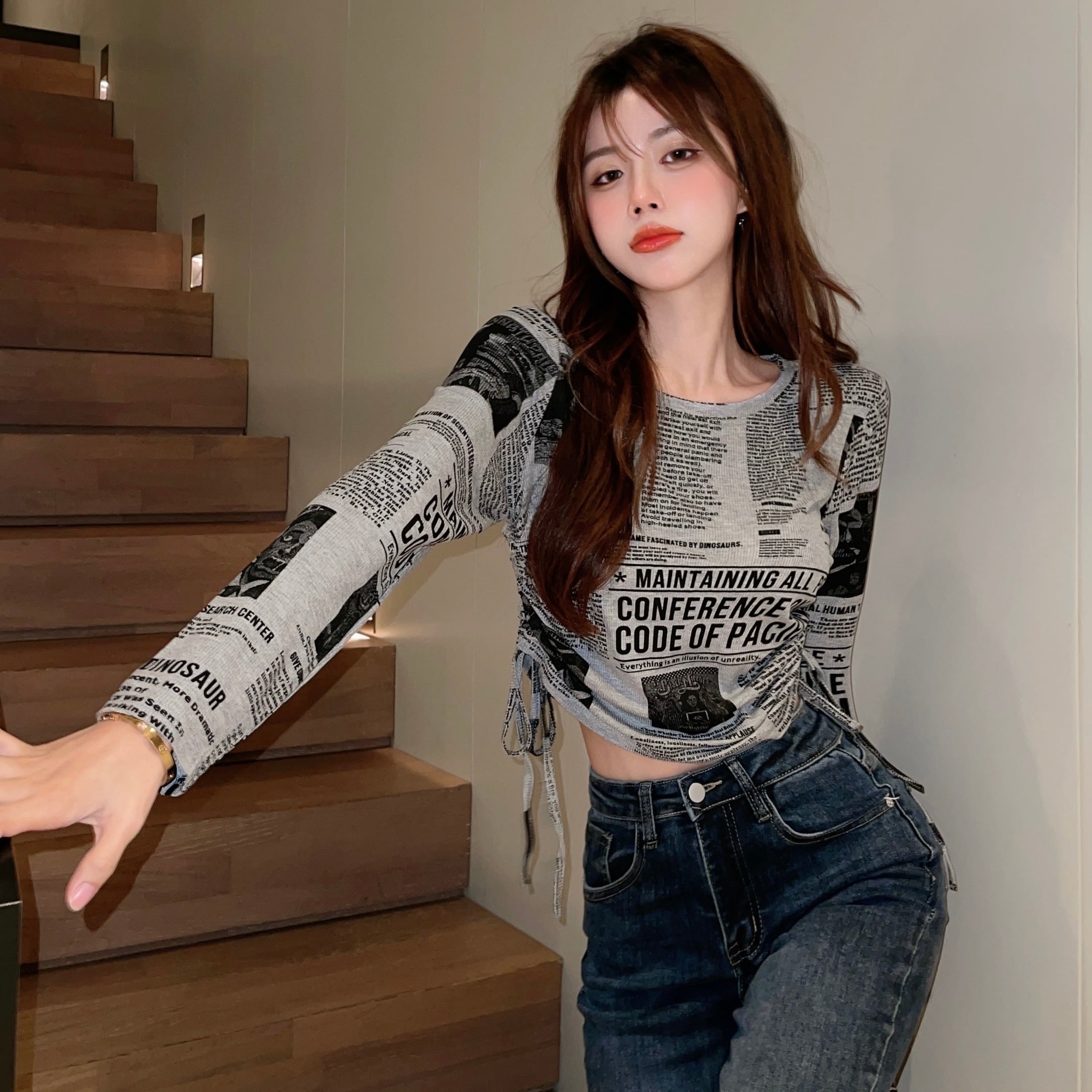 Tシャツ オータムスタンダードラウンドネックプリントショートギャザートップス ロング レトロ 秋物 Oネック セブンプリンセス76128641725