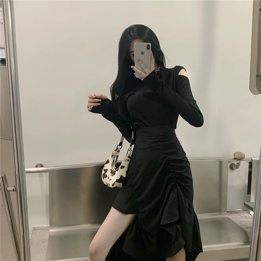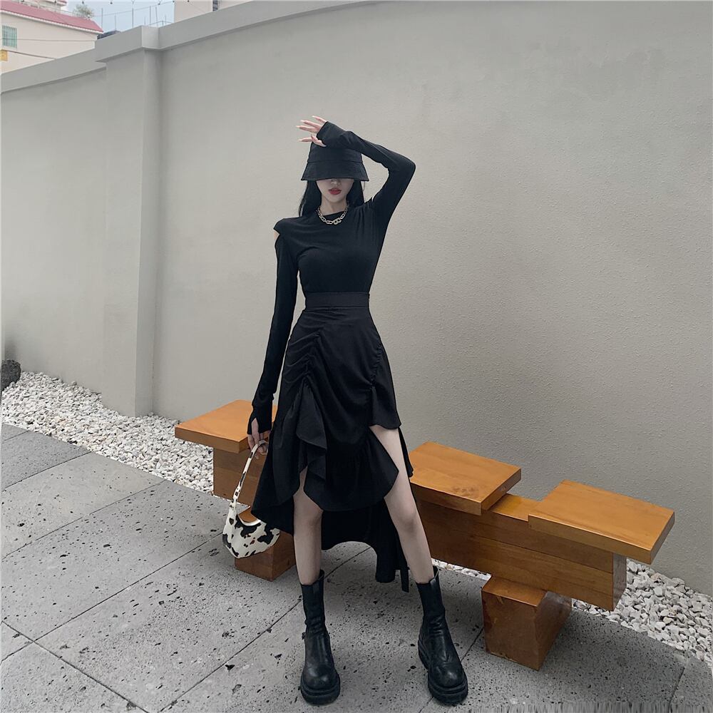 ダークハイウェストウェストスカート ストラップレスTシャツ オータムレッド ロング ストリート 秋物 セブンプリンセス99798676435