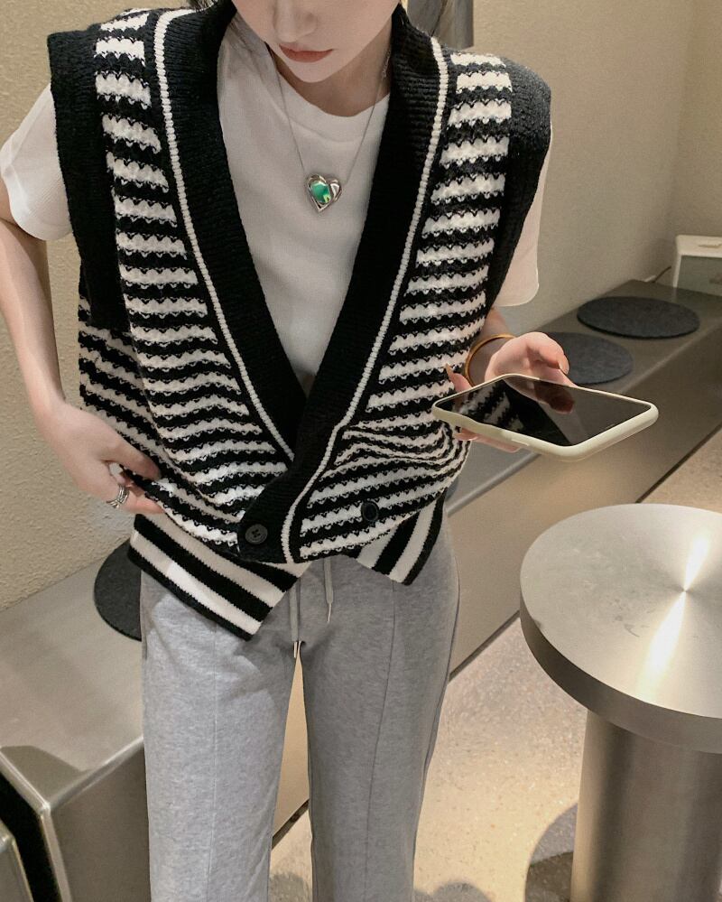ストライプVネックニットオータムノースリーブカーディガンセーター ジャケット ルーズ 秋物 セブンプリンセス96255511684