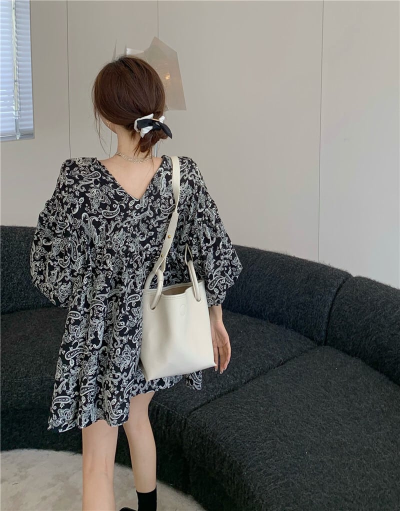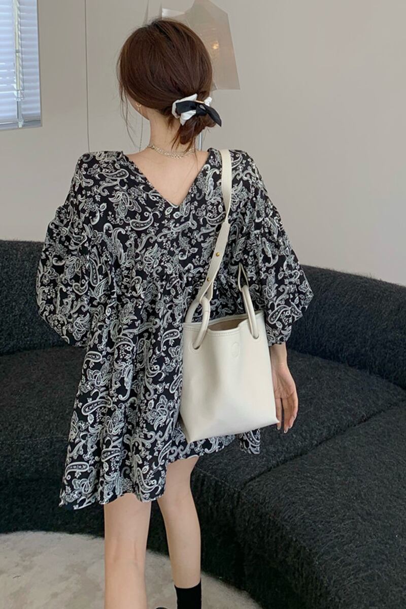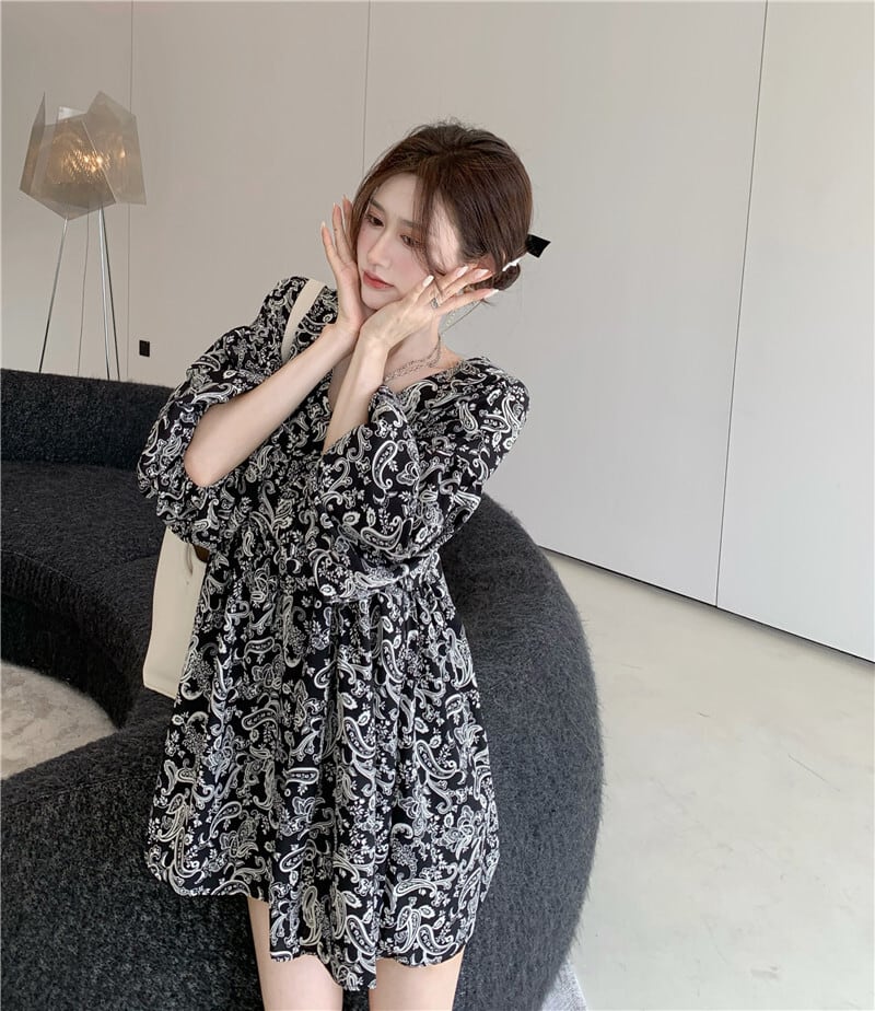 スリーブフローラルドレス サマースタンダードVネックショートスカート ルーズウェスト レトロ 夏物 花柄 セブンプリンセス63955382412