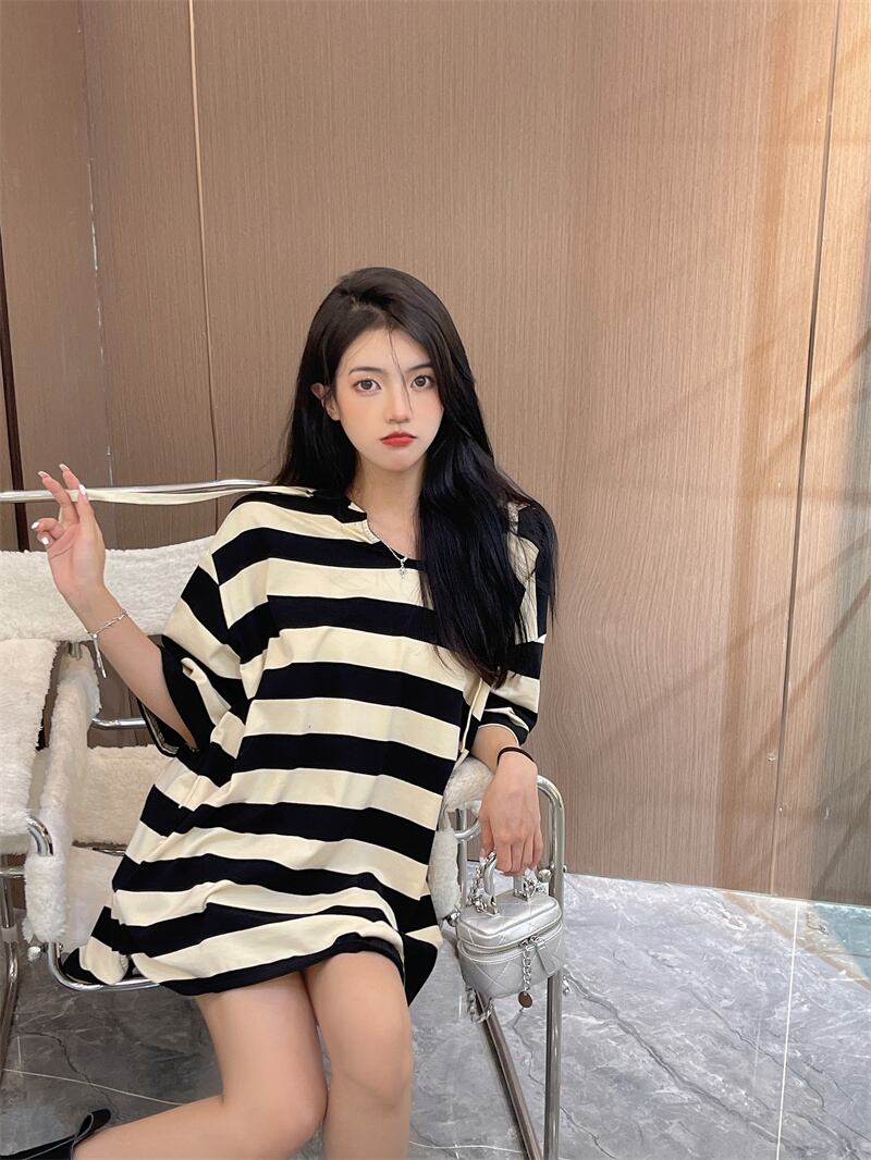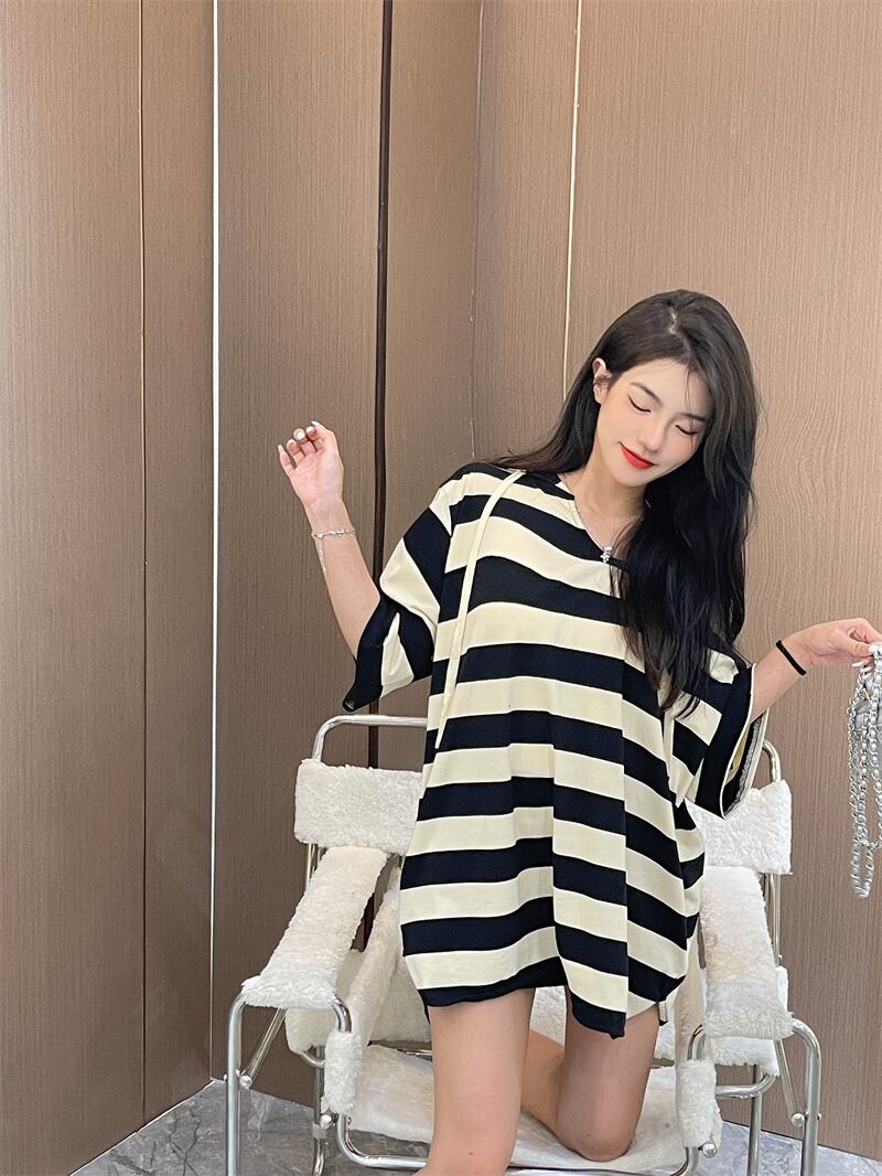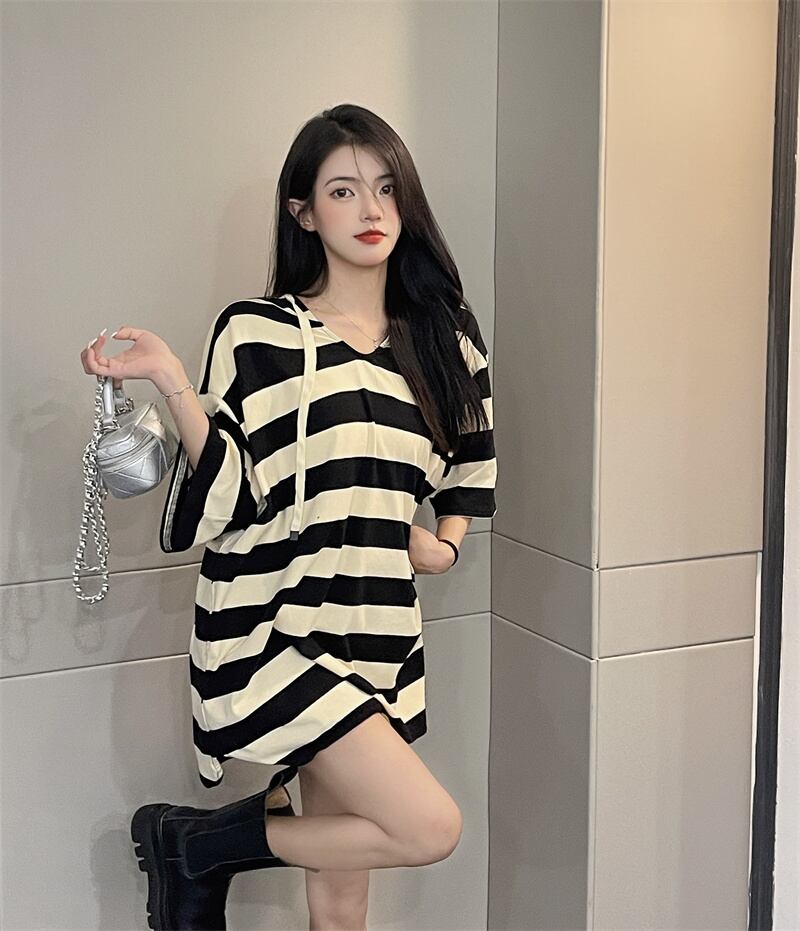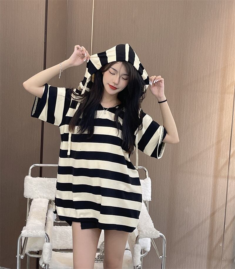カラーストライプフードオータムTシャツ レディースルーズカジュアルラウンドネックトップス 秋物 Oネック セブンプリンセス60092620767