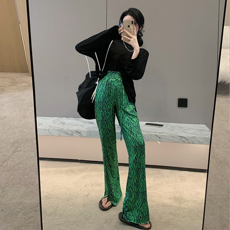 グリーンプリントパンツ サマー薄手ハイウェストルーズカジュアル 夏物 セブンプリンセス40658059822
