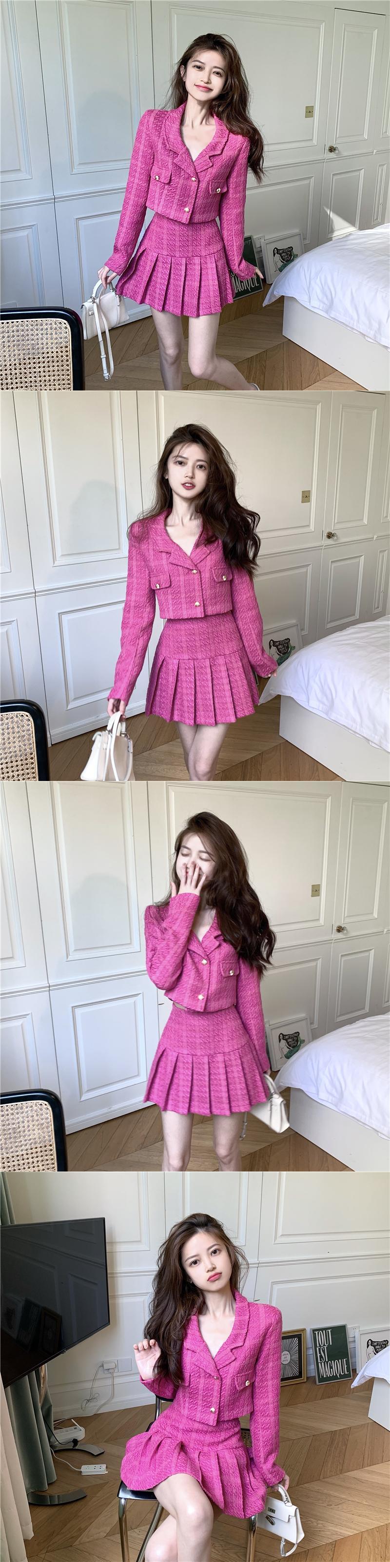 色:ローズレッドカーディガン,ローズレッドスカート,ネイビーブルーカーディガン,隠された青いスカート