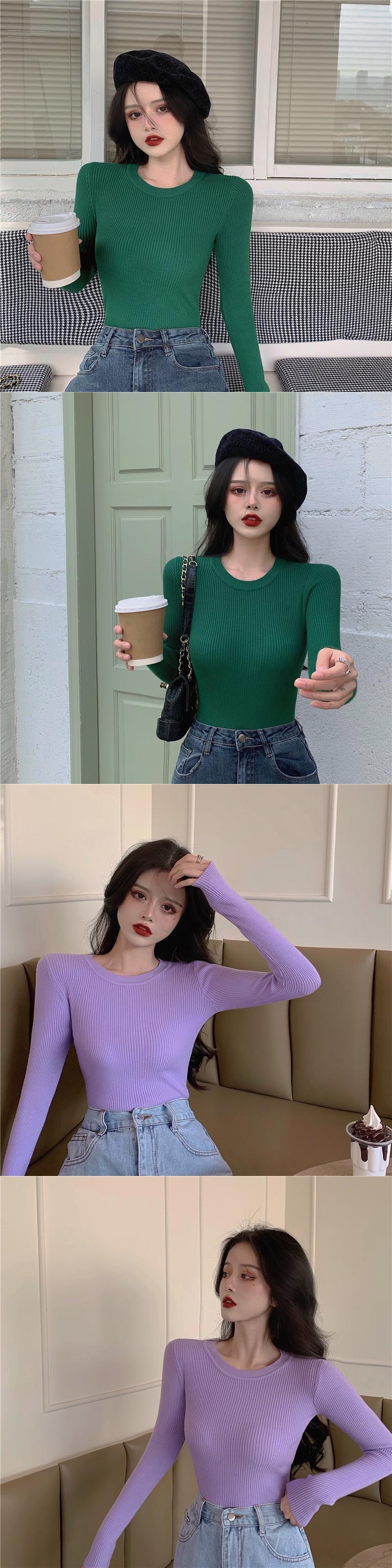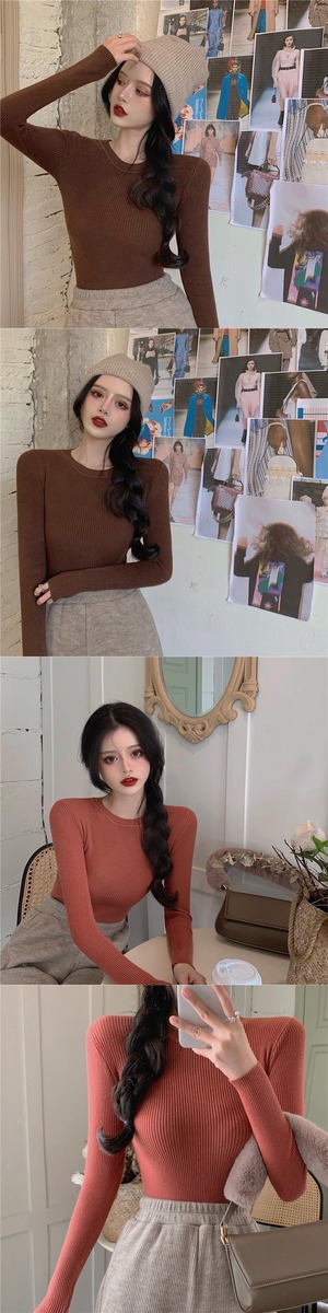 ラウンドネック薄手オータムソリッド トップス ロング 秋物 Oネック ソリッドカラー セブンプリンセス44331406305