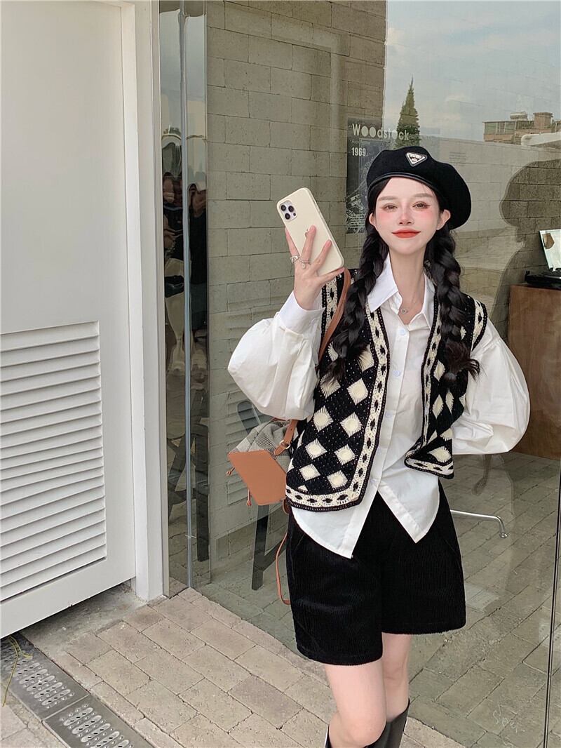 色:白のシャツ,チェックベスト,黒のショートパンツ