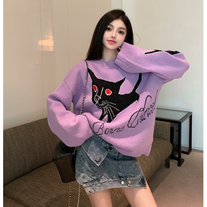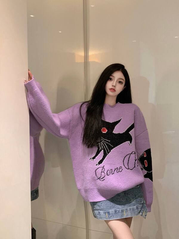 スタイルセーター レディースルーズオータム刺繍ニットトップス ロング 秋物 パープル セブンプリンセス95708569535