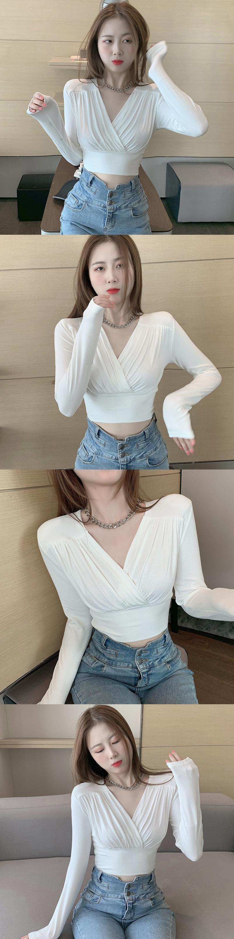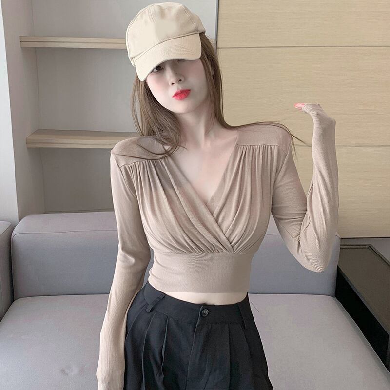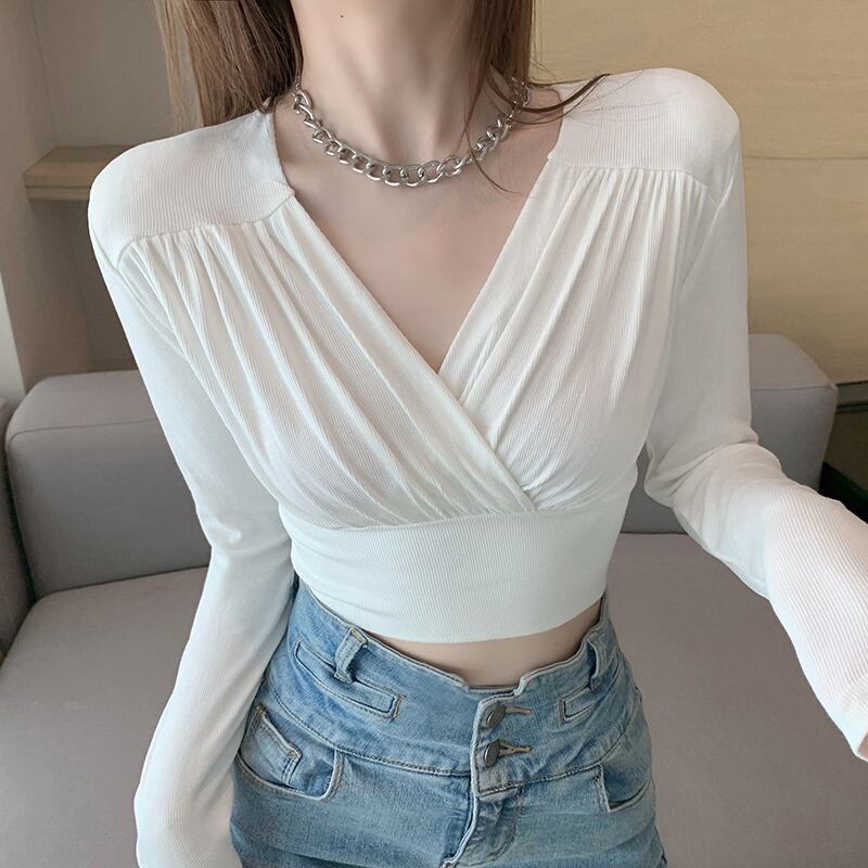 スタイルVネックTシャツ シャツ オータムショートクロップトップ トップス 薄手スリム ロング 秋物 セブンプリンセス30404493677