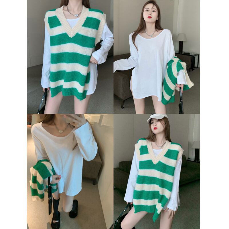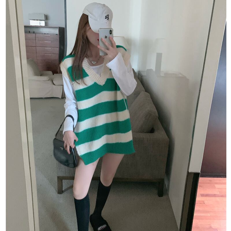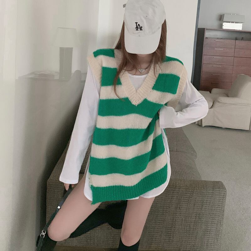 ニットVネックスプリングオータムルーズストライプノースリーブ 春物 秋物 セブンプリンセス86721324599