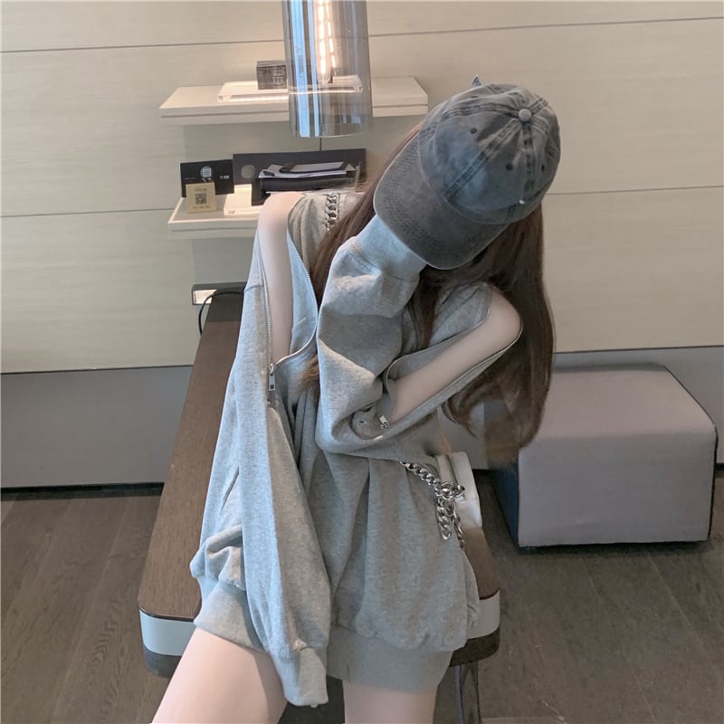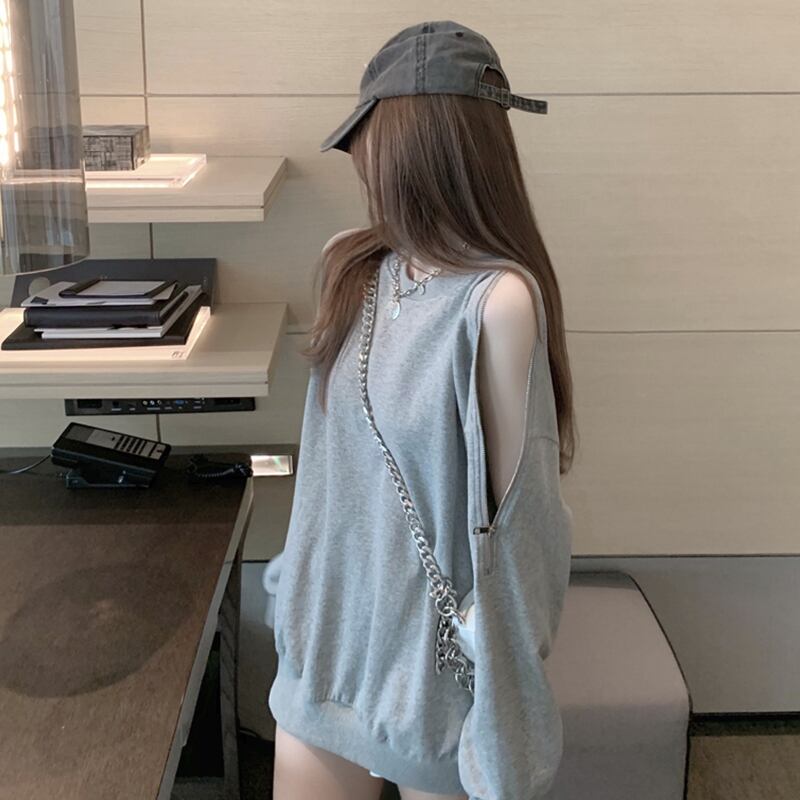 ラウンドネックセーター スプリングオータム薄手ルーズスタイルジッパーブラウス ロング 春物 秋物 Oネック オフショルダー セブンプリンセス8472942634