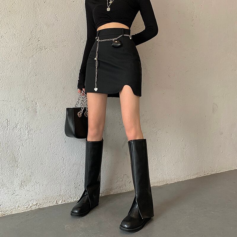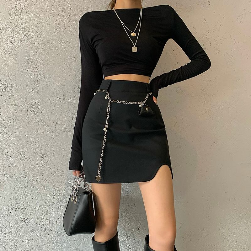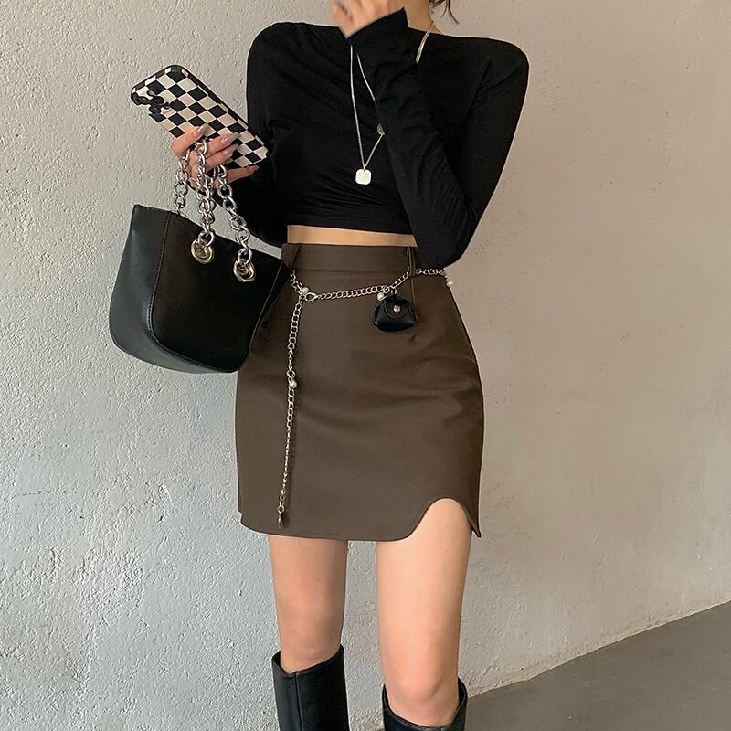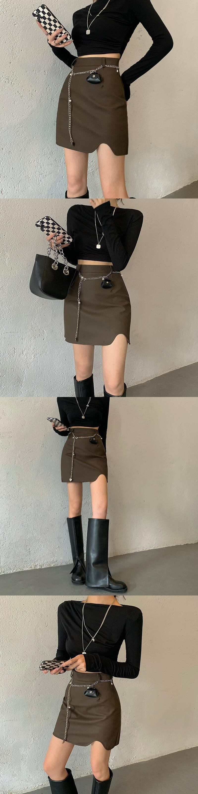 色:チェーンベルトバッグ,黒スカート,コーヒースカート