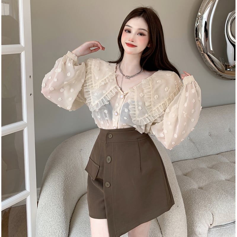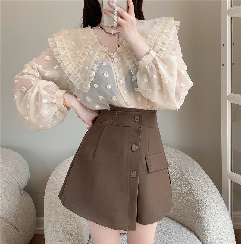 シフォンレースカラーシャツ ハイウェストウェストソリッド スカート ソリッドカラー セブンプリンセス21335327690
