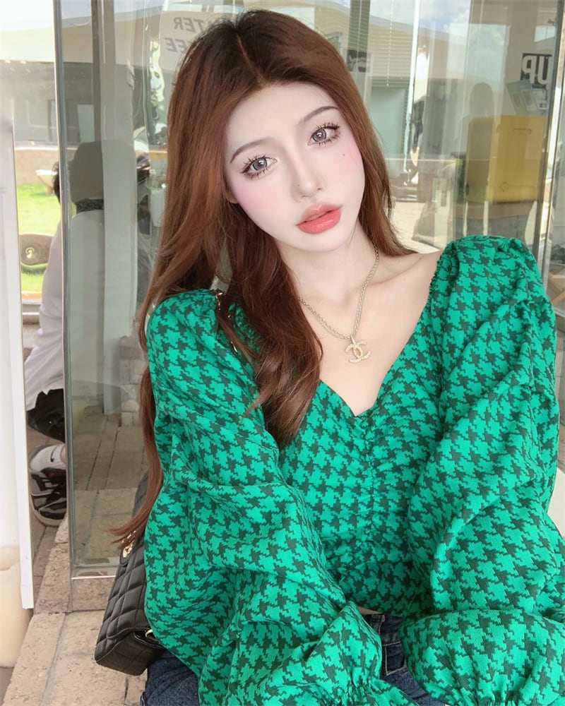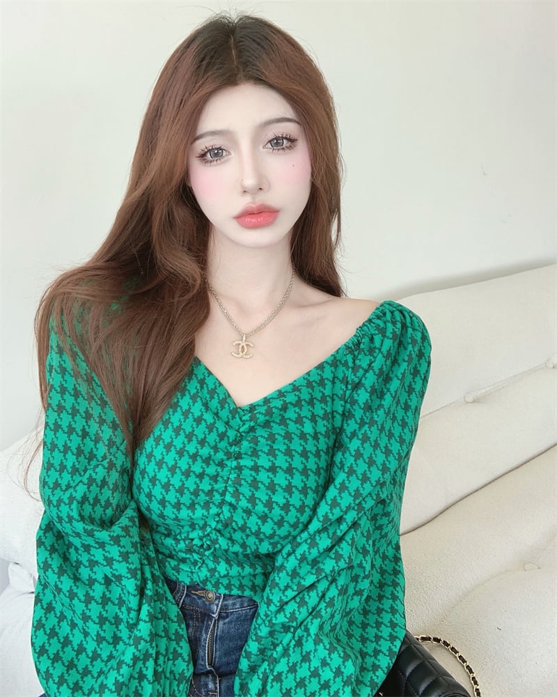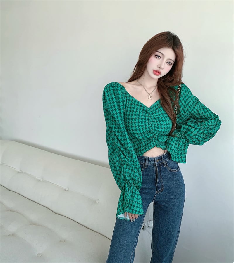 スタンダードカラートップス スリムウェストスリーブ格子柄シャツ ランタンスリーブ レトロ スクウェア セブンプリンセス74545200102