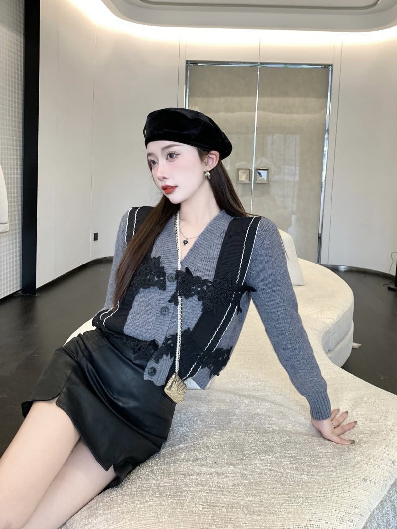 スタンダードレースカラーVネックニットカーディガン レトロ ステッチ セブンプリンセス32197221095
