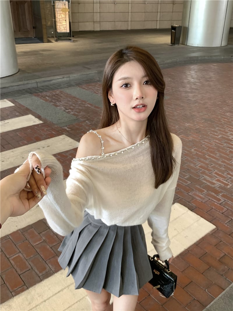 オータムニットセーター 薄手ルーズショートスタイルカジュアルトップス ロング 秋物 オフショルダー セブンプリンセス3067941637