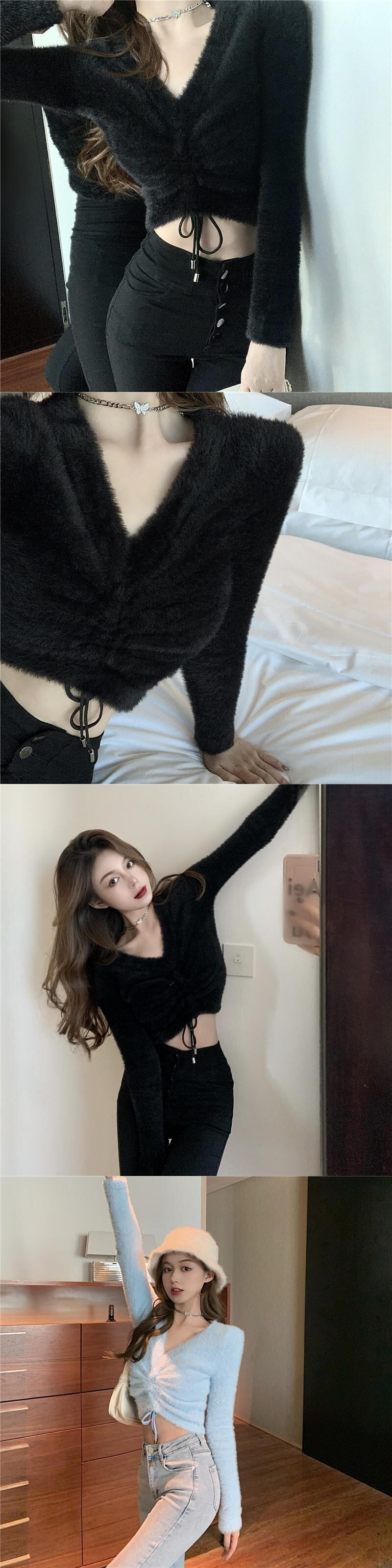 Vネックショートクロップドギャザースタイルハイウェストスリムセーター セブンプリンセス91573781366