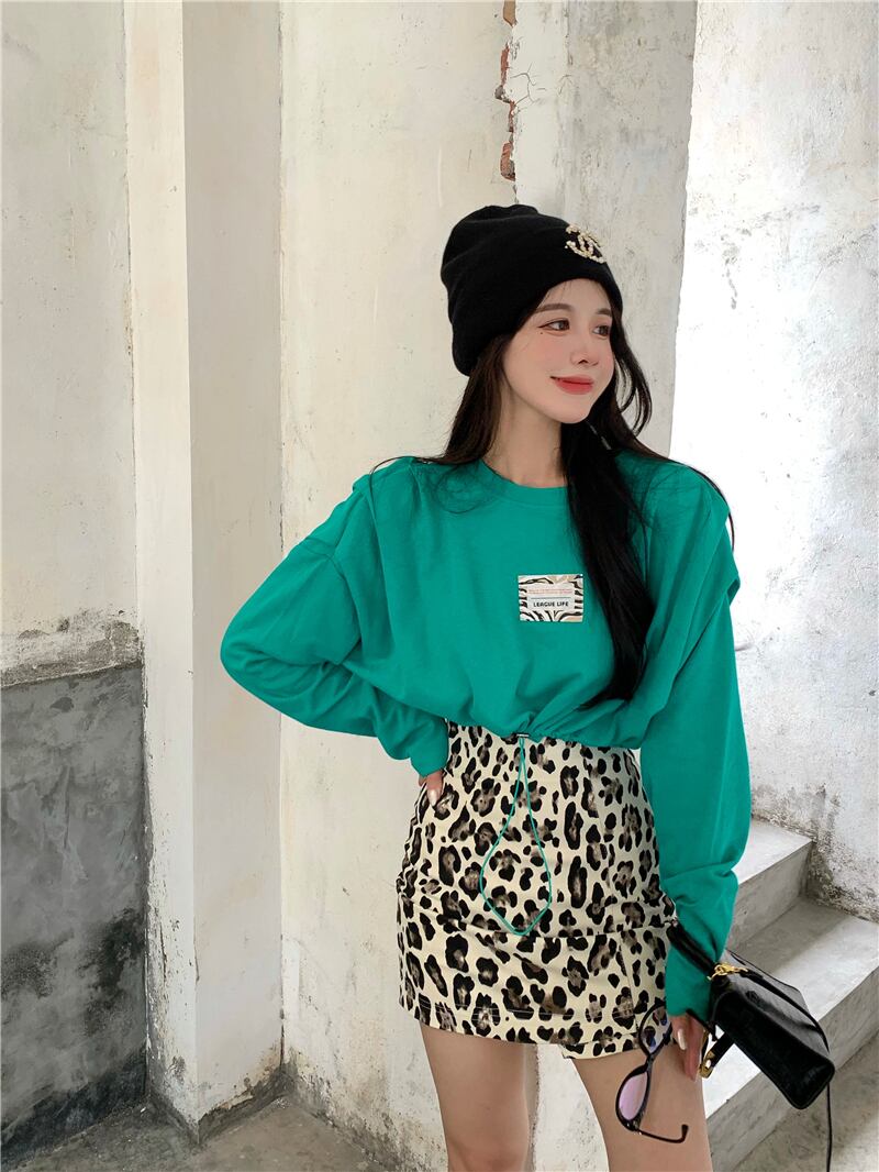 ギャザーウェストTシャツ ルーズカジュアルトップス レオパードプリント柄ハイウェストスカート セブンプリンセス57483755654