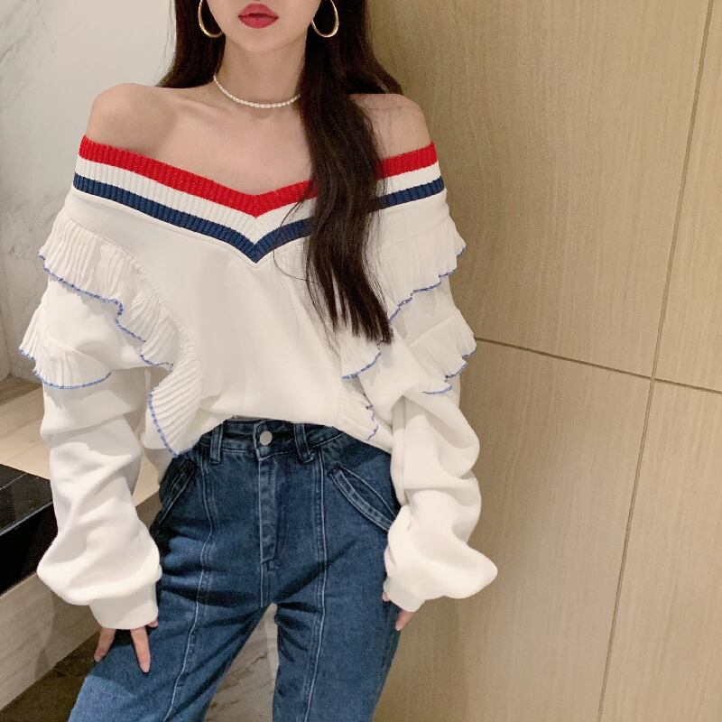 オータムスタイルカラーVネックセーター レディース コットン 秋物 ステッチ セブンプリンセス141647811