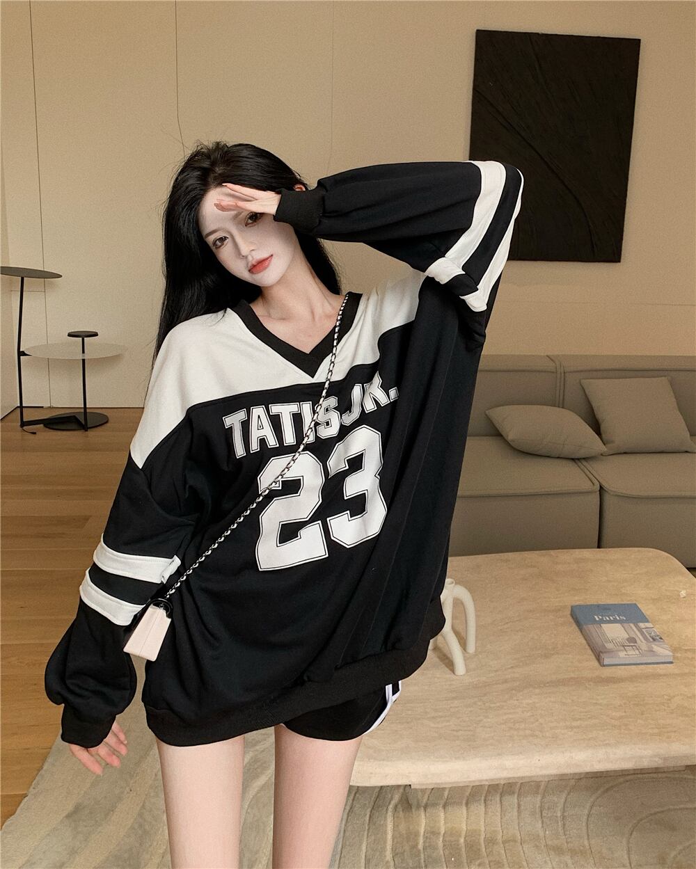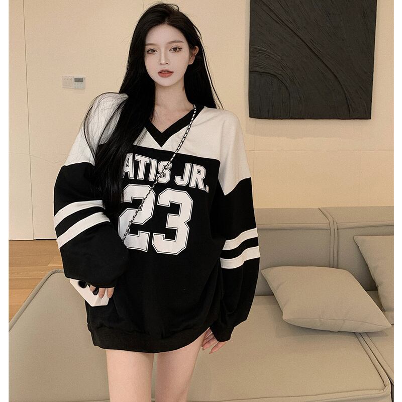 スプリングオータムセーター レディースルーズプリントカラーカジュアルVネックトップス ロング 春物 秋物 セブンプリンセス45276616820