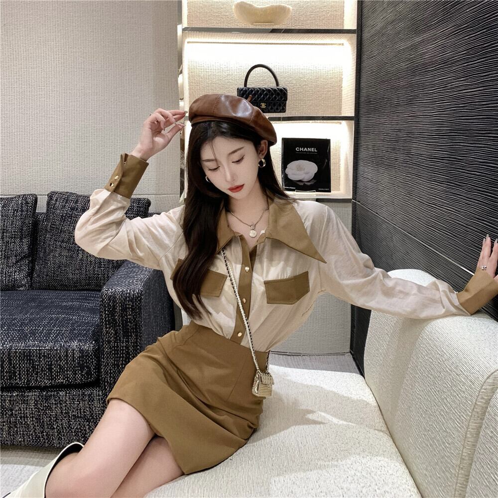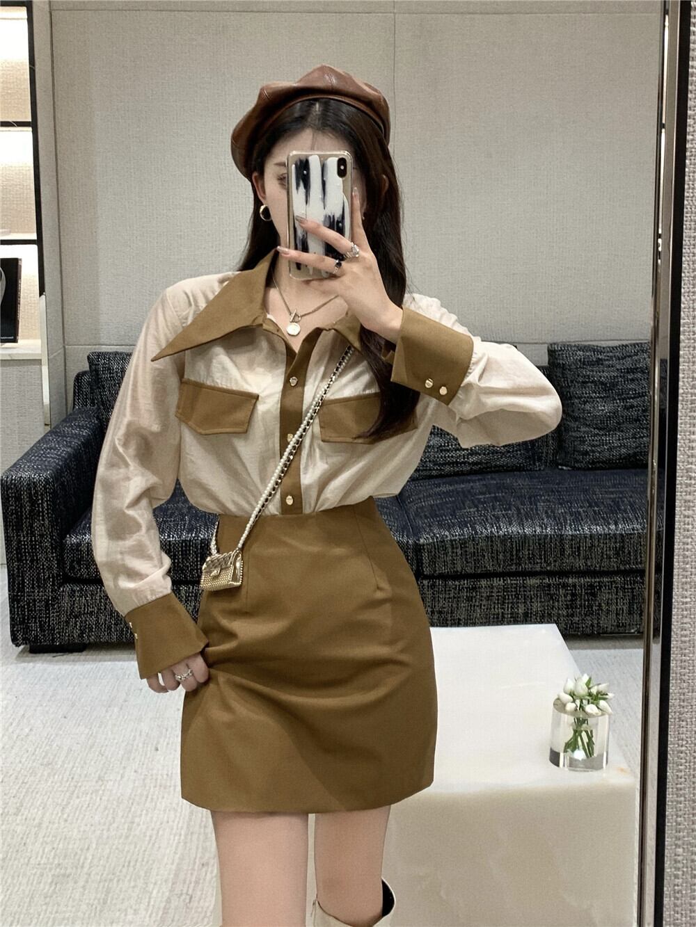 色:コーヒートップ,コーヒー色のスカート,ブルートップ,青いスカート